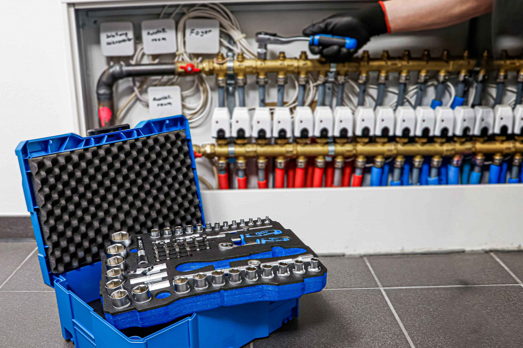 Osnovna oprema za zahtevnega mehanika in domače mojstre, komplet s 77 kosi ponuja širok spekter uporabe, inteligenten transportni in shranjevalni sistem, enoročno odpiranje in zapiranje ter povezovanje s drugimi kovčki, iz stabilne ABS plastike, s funkcionalnim ročajem in T-Loc zapiralom, del sistema zložljivih kovčkov, zaščitna obloga v pokrovu, notranje mere 383 x 127,5 x 267 mm, zaščita pred pljuski, nasadni ključi, podaljški, raglje, klešče in izvijači iz krom-vanadijevega jekla, površina mat kromirana, biti iz kakovostnega jekla S2.