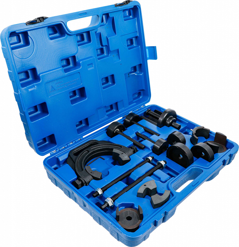 Komplet orodij za odstranjevanje in montažo gumijastih puš na zadnjih oseh pri vozilih Toyota (Avensis, Corolla, Yaris, Camry …). Vključuje izvlekače, potisne elemente, C-okvir, vretena in adapterje za različne dimenzije puš.