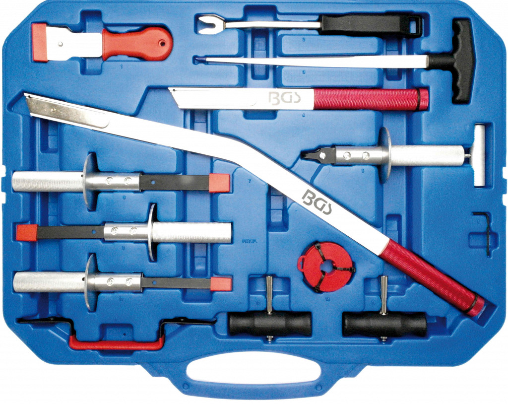 Komplet orodij za pravilno demontažo lepljenih vetrobranskih, zadnjih in stranskih stekel. Vključuje različna rezila, strgala, žico, ročaje, orodja za...