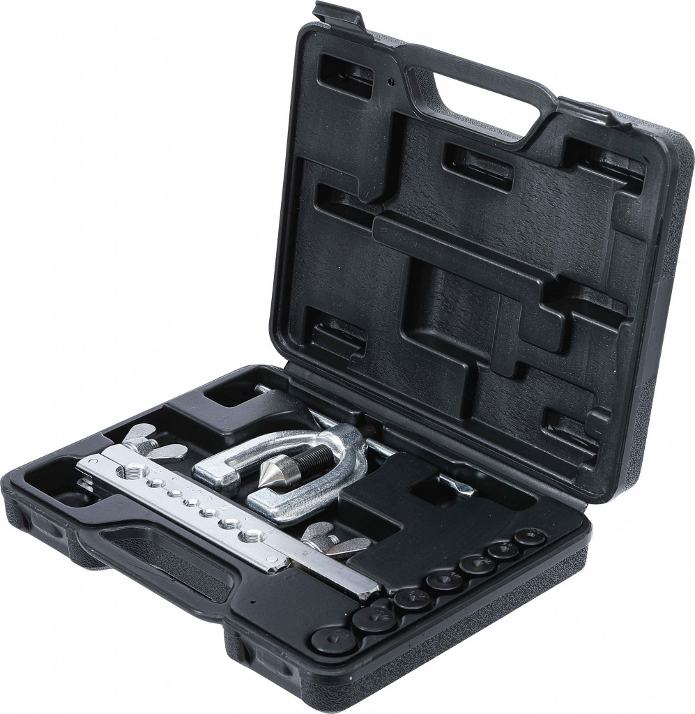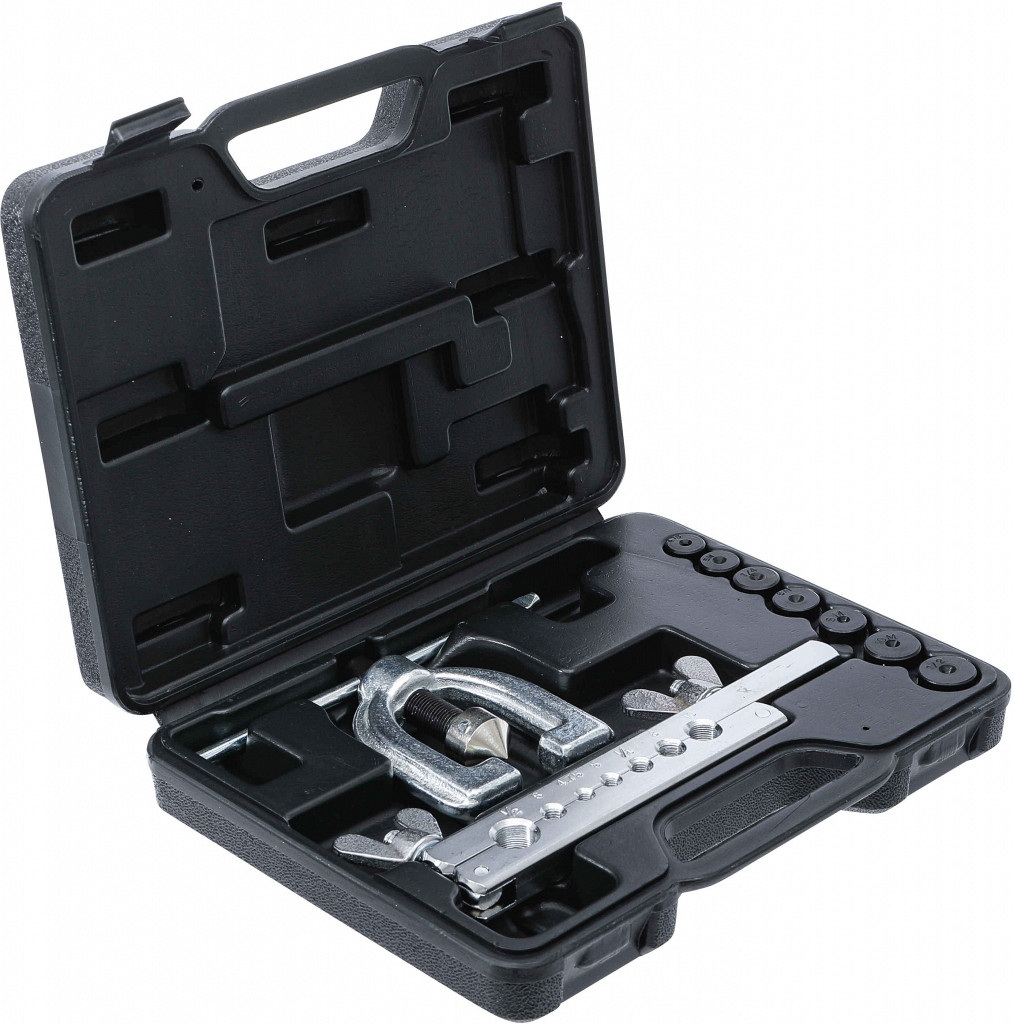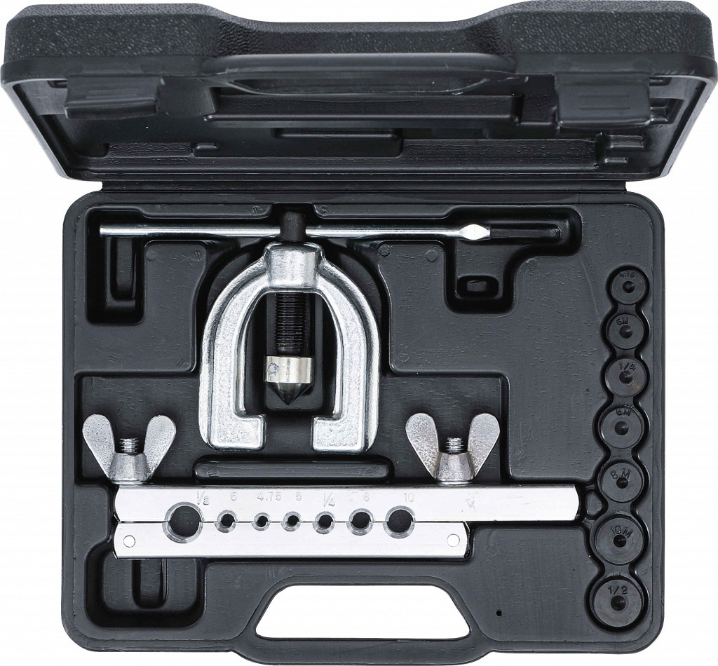 Posebno orodje za izdelavo enojnih razbremenilnih stikov tipa D, dvojnih stikov tipa E (SAE) in dvojnih stikov tipa F. Primerno za cevi z debelino stene do 1 mm. Dobava vključuje osnovno napravo, eno vpenjalno čeljust ter sedem tlačnih nastavkov Ø 4.75 – 5 – 6 – 8 – 10 mm, 1/4" – 1/2".