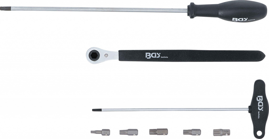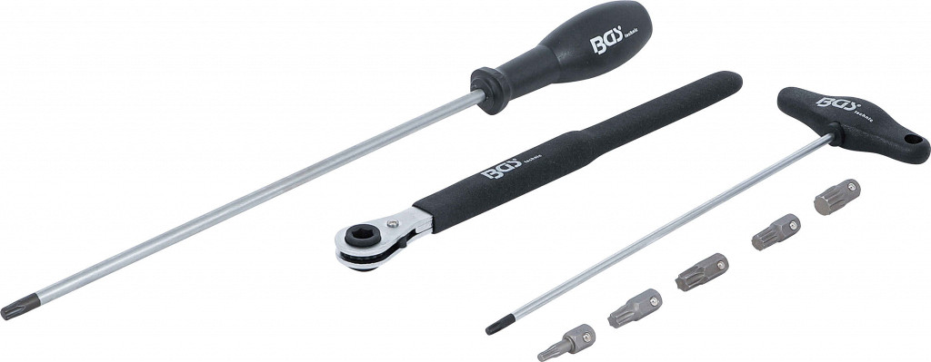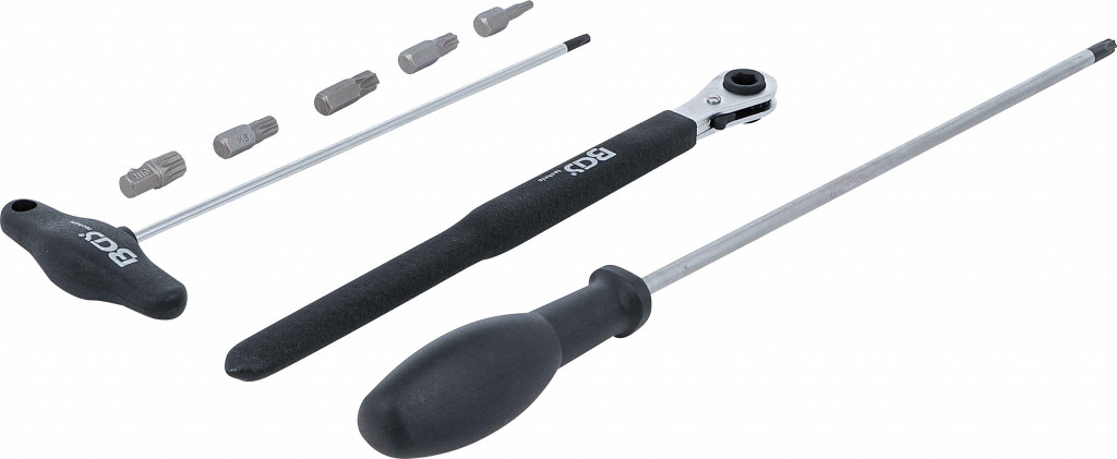 Posebej sestavljen komplet za delo na VW/Mercedes-Benz/Porsche/Audi vratnih tečajih. Vključuje: izvijač T30 (dolžina 360 mm), T-ročaj izvijač T20 (dolžina...
