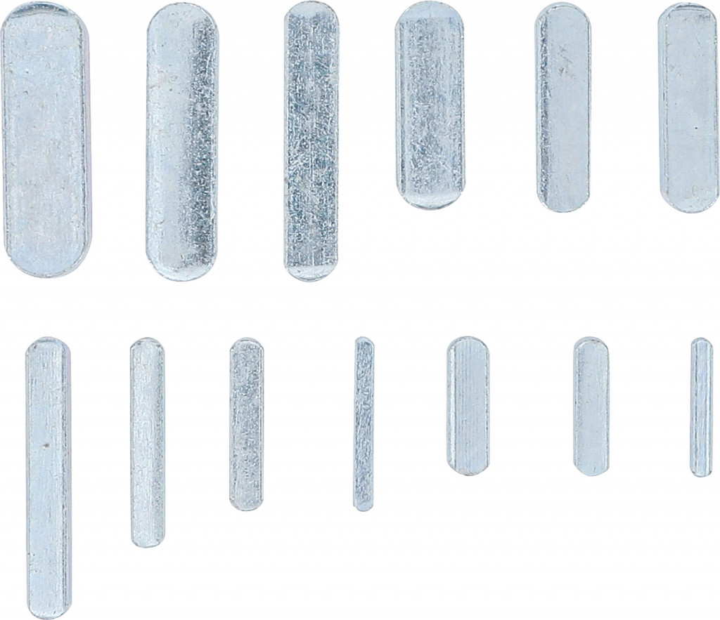 Komplet vzmetnih klinov za zagozditev pestov na gredi v plastični škatli. Vsebina: 4 kosi 3 x 3 x 20 mm, 4 kosi 3 x 3 x 25 mm, 5 kosov 5 x 5 x 20 mm, 5 kosov 5 x 5 x 25 mm, 5 kosov 5 x 5 x 30 mm, 5 kosov 6 x 6 x 20 mm, 5 kosov 6 x 6 x 30 mm, 5 kosov 6 x 6 x 40 mm, 5 kosov 8 x 7 x 30 mm, 5 kosov 8 x 7 x 40 mm, 5 kosov 10 x 8 x 30 mm, 5 kosov 10 x 8 x 40 mm, 2 kosa 12 x 8 x 40 mm.