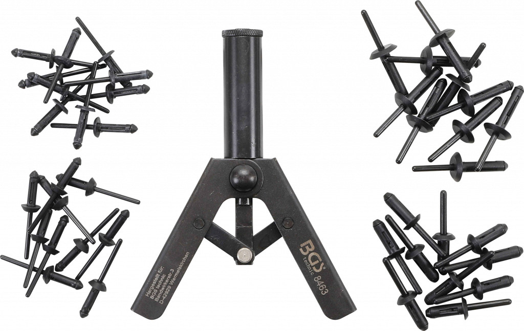 Klešče za kovičenje plastičnih panelov v vozilih in čolnih, primerne za slepe koviče s premerom mandlja 2–4,5 mm, priložen zakovičnik in 40 plastičnih...