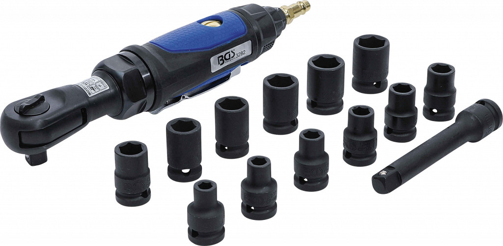 Močan pnevmatski raglja ključ s funkcijo obratne smeri na glavi, 4-stopenjsko nastavitvijo navora, 3-stopenjskim planetnim prenosom, ergonomskim gumiranim ročajem in priloženimi 12 udarnimi nasadnimi ključi ter podaljškom.