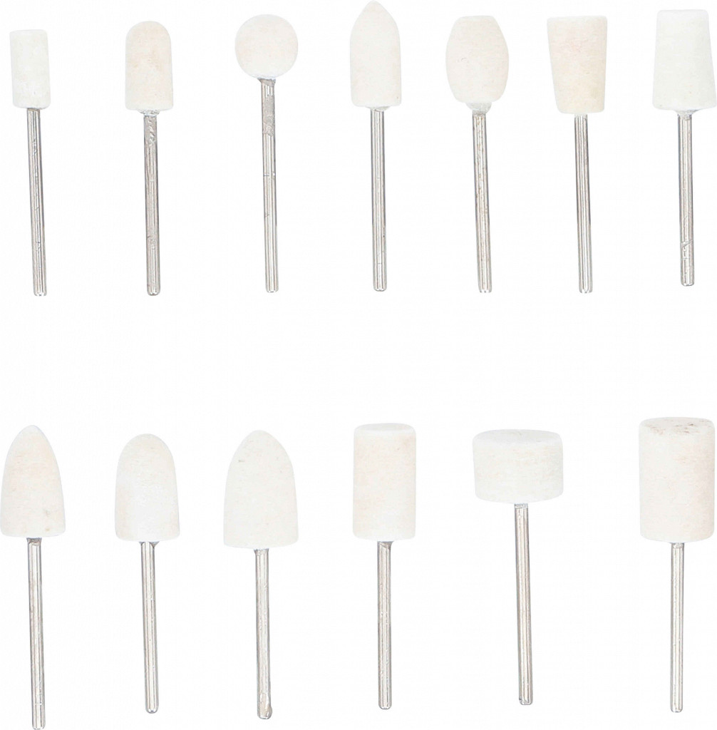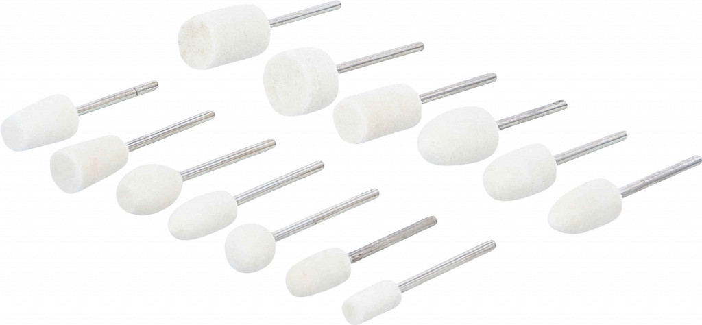 Za poliranje kovin, stekla, plemenitih kovin, porcelana in plastike zagotavlja učinkovito čiščenje površin različne oblike brusilnih glav primerno za večino komercialno dostopnih rotacijskih orodij, ki so primerna za brušenje, poliranje, ostrenje in raziglevanje iz visokokakovostnega volnenega klobučevine s premerom gredi 2,34 mm (3/32 "). 1 glava za poliranje volnene klobučevine, cilindrične oblike, 20 x 11,5 mm1 polna glava iz volnene klobučevine, cilindrična oblika, 9 x 14 mm1 polna glava iz volnene filcevine, cilindrična oblika, 17,5 x 10 mm1 volnena filčevina poliranje glave, cilindrična oblika, 14,5 x 6 mm1 volnena klobučevina ogive oblika, 20 x 12 mm1 volnena klobučevina ogive oblika, 17 x 8 mm1 volnena klobučevina ogive oblika, 18,5 x 10 mm1 volnena klobučevina, 19,5 x 12 mm1 oblika volnene klobučevine, 18 x 6,5 x 9,5 mm1 oblika krogle iz volnene klobučevine, 9,5 mm1 oblika volnene klobučevine, 15 x 10 mm1 oblika volnene klobučevine, 14,5 x 9 mm1 oblika volnenega klobučevine, 19 x 10 x 7 mm