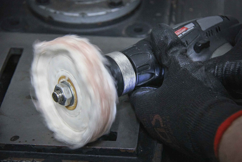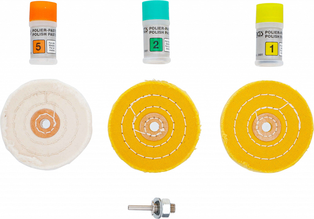 Komplet za odstranjevanje prask in poliranje trdih kovin, kot so jeklo, nerjavno jeklo, železo, Vsebuje naslednja orodja: z 3 polirnimi blazinicami (2 trdi, 1 srednja), Z vrtalnim čelom, Z 3 polirnimi pastami za trde kovine.