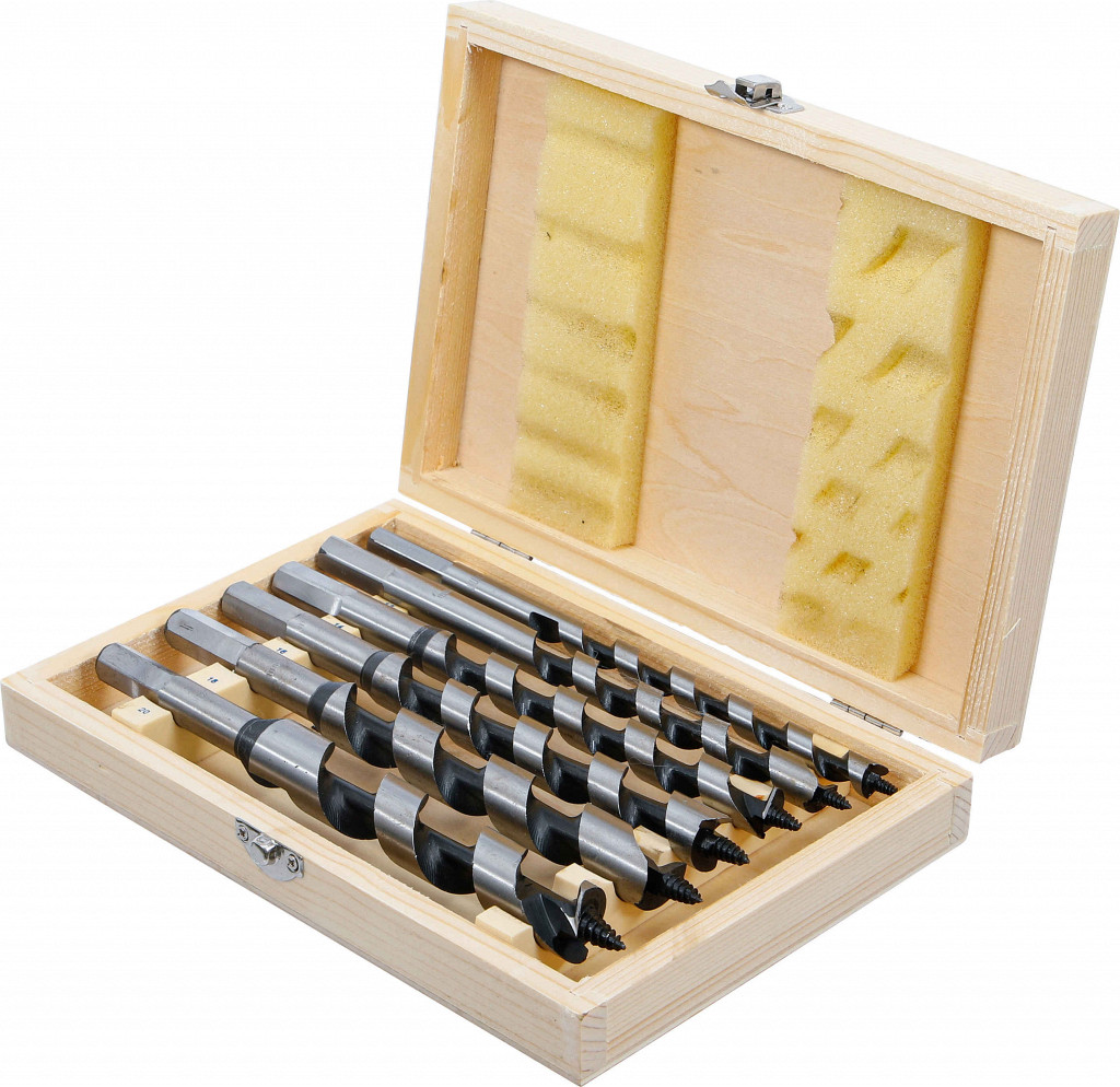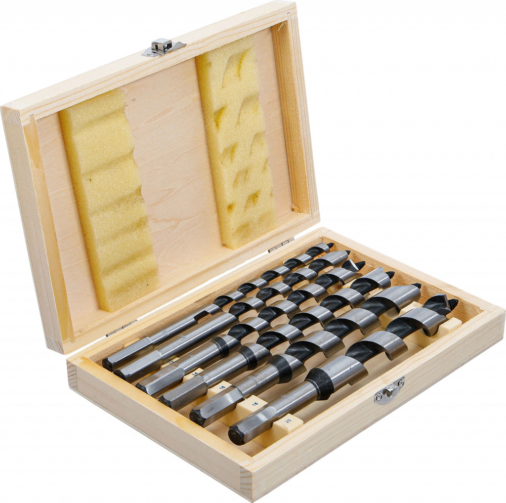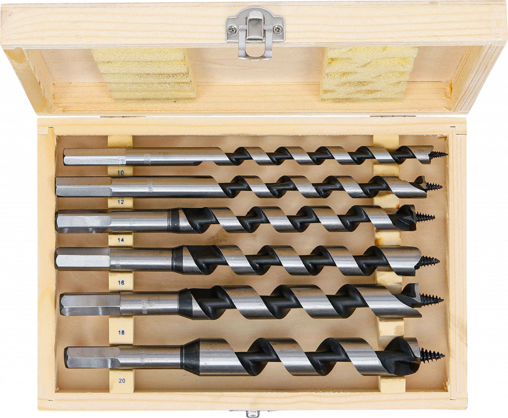 Ima šesterokotni vpenjalni stebelni del. Primeren je za trd in mehak les. V kompletu je 6 svedrov s premeri 10 – 12 – 14 – 16 – 18 – 20 mm, shranjenih v leseni škatli.
