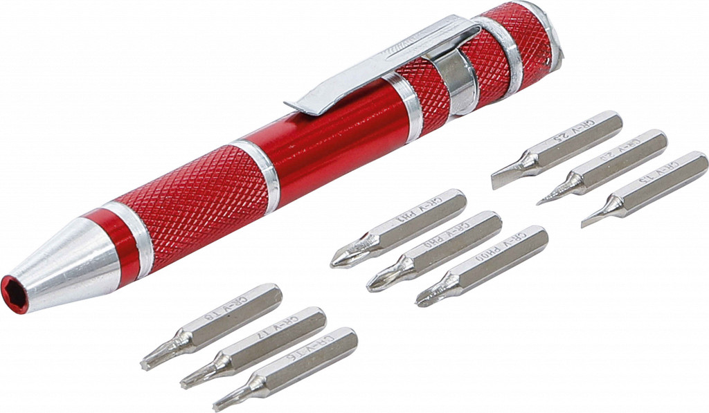 Primerno za širok spekter elektronskih aplikacij, priročno in robustno, za fino ročno delo na pametnih telefonih, tablicah, računalnikih, očalih, urah in drugem, ročaj proti zdrsu z valovito površino, dolžina: 27 mm, material: aluminij / krom-vanadij, 1 ročaj za izvijač, magnetni, s sponko za pas, z vrtljivim magazinom na zadnji strani, dolžina: 110 mm, 3 nastavki, zunanji šestkotnik pogon, 4 mm pogon, reža SL 1,5 - 2 - 2,5 mm, 3 nastavki, zunanji šestkotnik pogon, 4 mm pogon, križni PH00 - PH0 - PH1, 3 nastavki, zunanji šestkotnik pogon, 4 mm pogon, T-Star (za Torx) T6 - T7 - T8