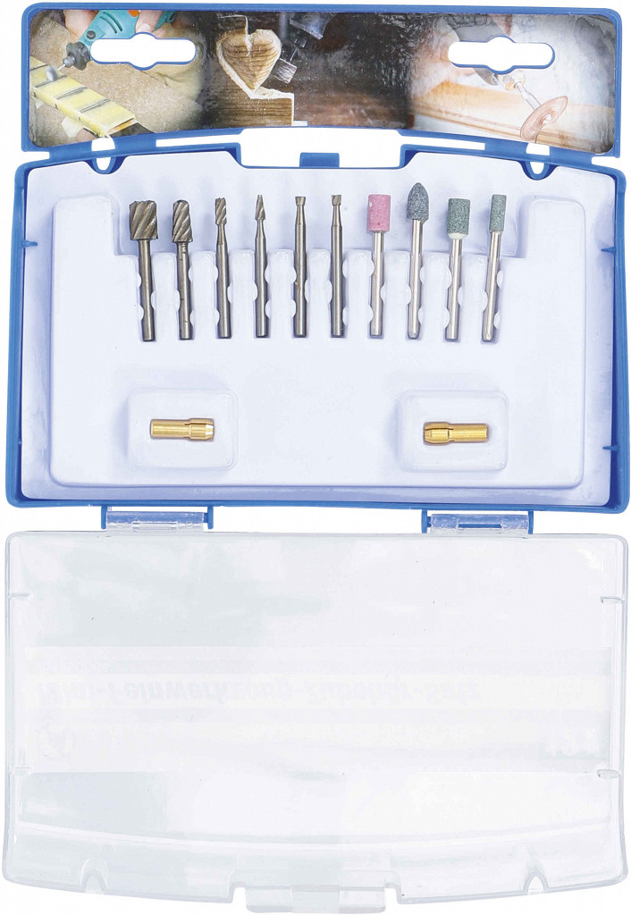 Set rezkarjev in brusov za male dele, za brušenje, graviranje in rezkanje, največja hitrost 35.000 obr./min, premer stebla 3 mm, vključeni adapterji za 5 mm vpenjalne glave, obseg dobave: brusni kamni in rezkarji premerov 3–8 mm različnih oblik