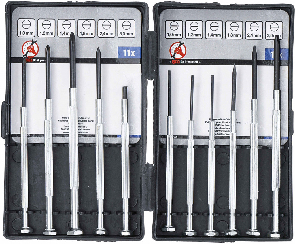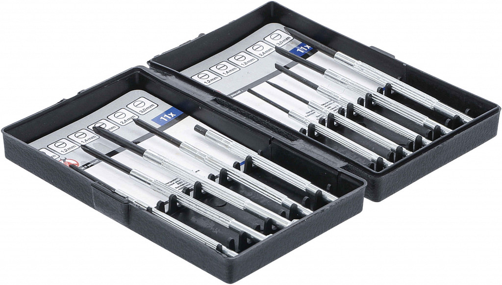 Set preciznih izvijačev v plastičnem kovčku: SL 1.0 mm, SL 1.2 mm, SL 1.4 mm, SL 1.8 mm, SL 2.4 mm, SL 3.0 mm, PH00, PH0, PH1, šilo, magnetno držalo.