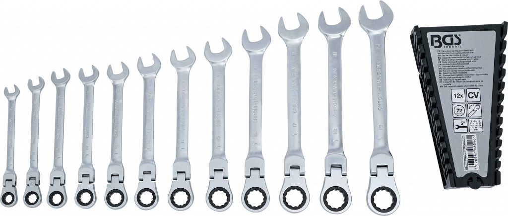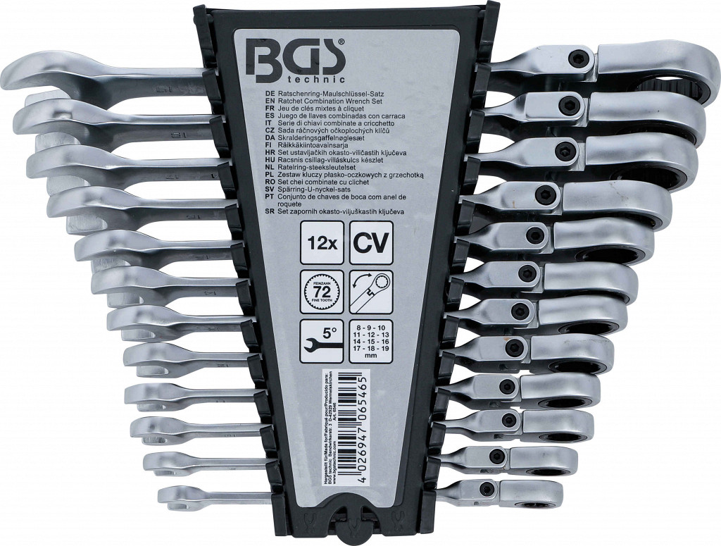 Obsežen set ragljastih kombiniranih ključev z vsemi standardnimi dimenzijami, z 180° nastavljivo ragljo na obročni strani, drobno zobčenje 72 zob, kot zasuka 5°, v nosilcu; vsebuje ključe od 8 do 19 mm.