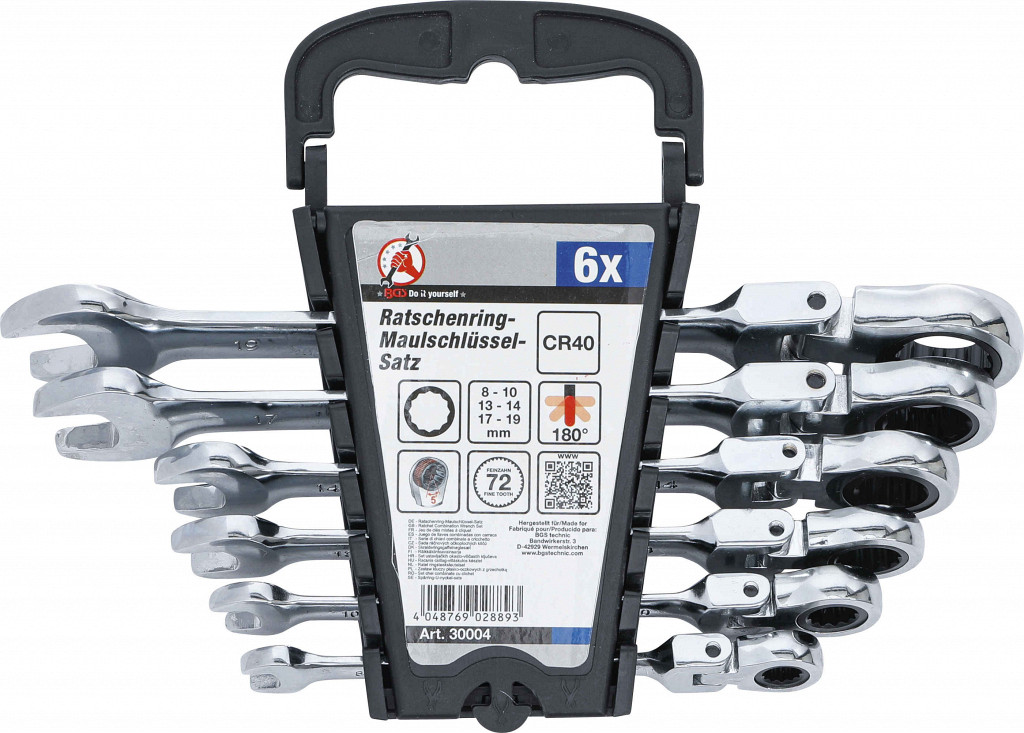Ratschet funkcija s 72 zobmi. Zelo majhen nastavitveni kot 5°. 180° gibljiva raglja. Obseg dobave: ragljo kombinirani ključ 8 mm, 9 mm, 10 mm, 11 mm, 12 mm,...