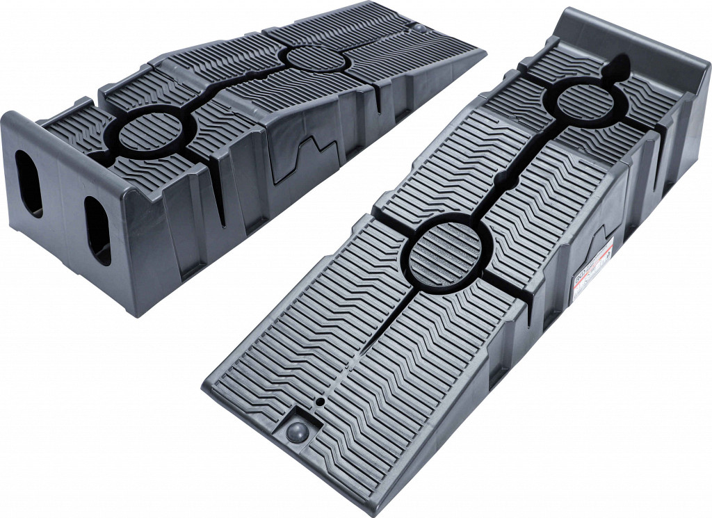 Močna in robustna izvedba, sestavljeno iz dveh delov za prihranek prostora pri transportu in shranjevanju, uporabno na sprednjih ali zadnjih pnevmatikah, lahko in trdno varno drži težo vozila, dodatno široka vozna površina za pnevmatike do širine 230 mm, uporablja se izključno v paru, višina dviga 180 mm.