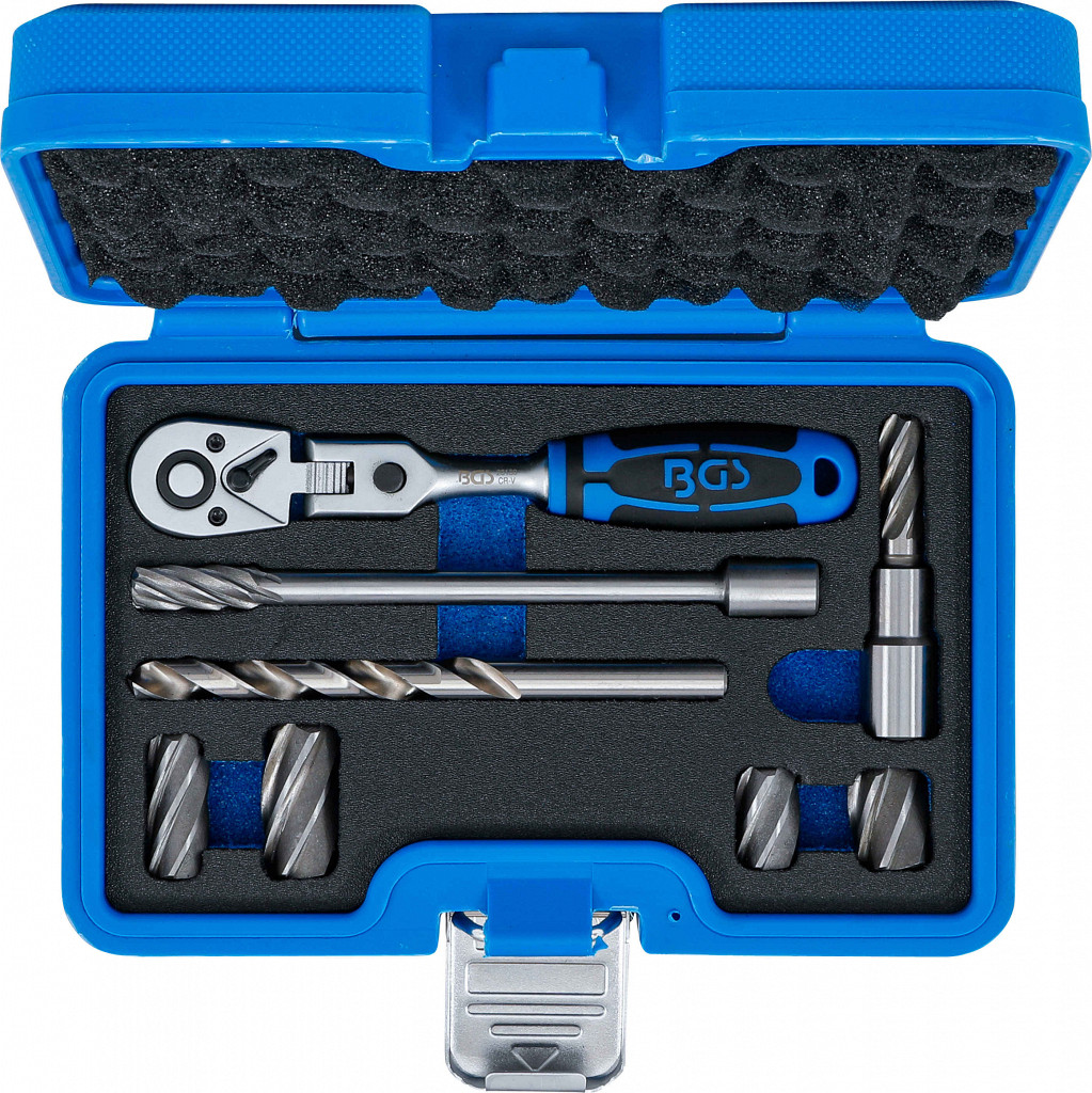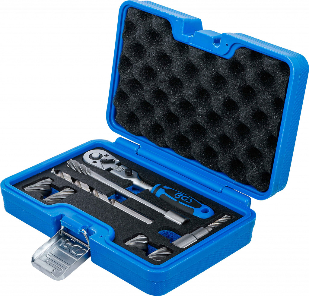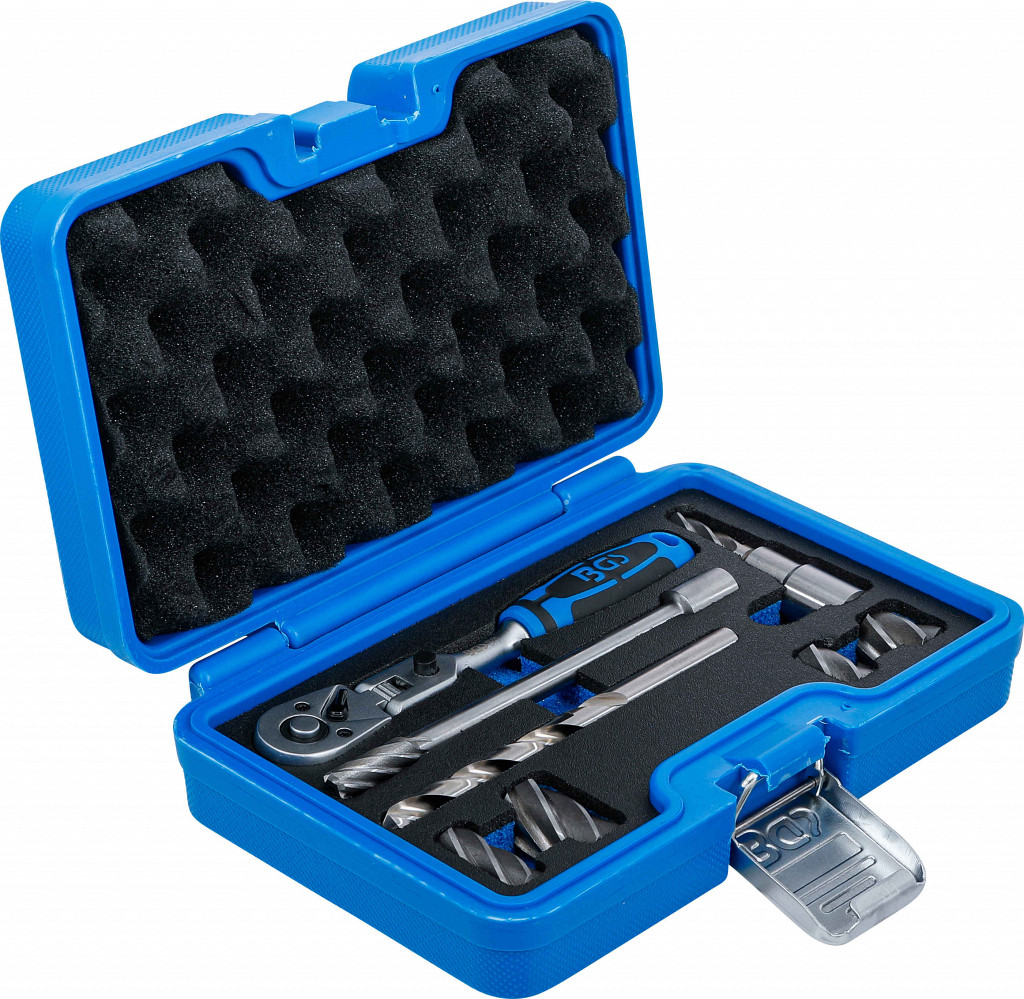 Orodje za čiščenje odprtine ABS senzorja v ležišču kolesnega ležaja. Odstrani umazanijo, rjo in delce korozije ter prepreči poškodbe novega senzorja. Primerno za Audi A3, Q3, TT, Seat Altea, Ibiza, Leon, Škoda Fabia, Octavia, Superb, VW Golf, Jetta, Passat, Polo, Scirocco, Sharan, T5, Tiguan, Touran, Opel Insignia in druge. Priloženi so raglja, sveder in več različnih razvrtal.