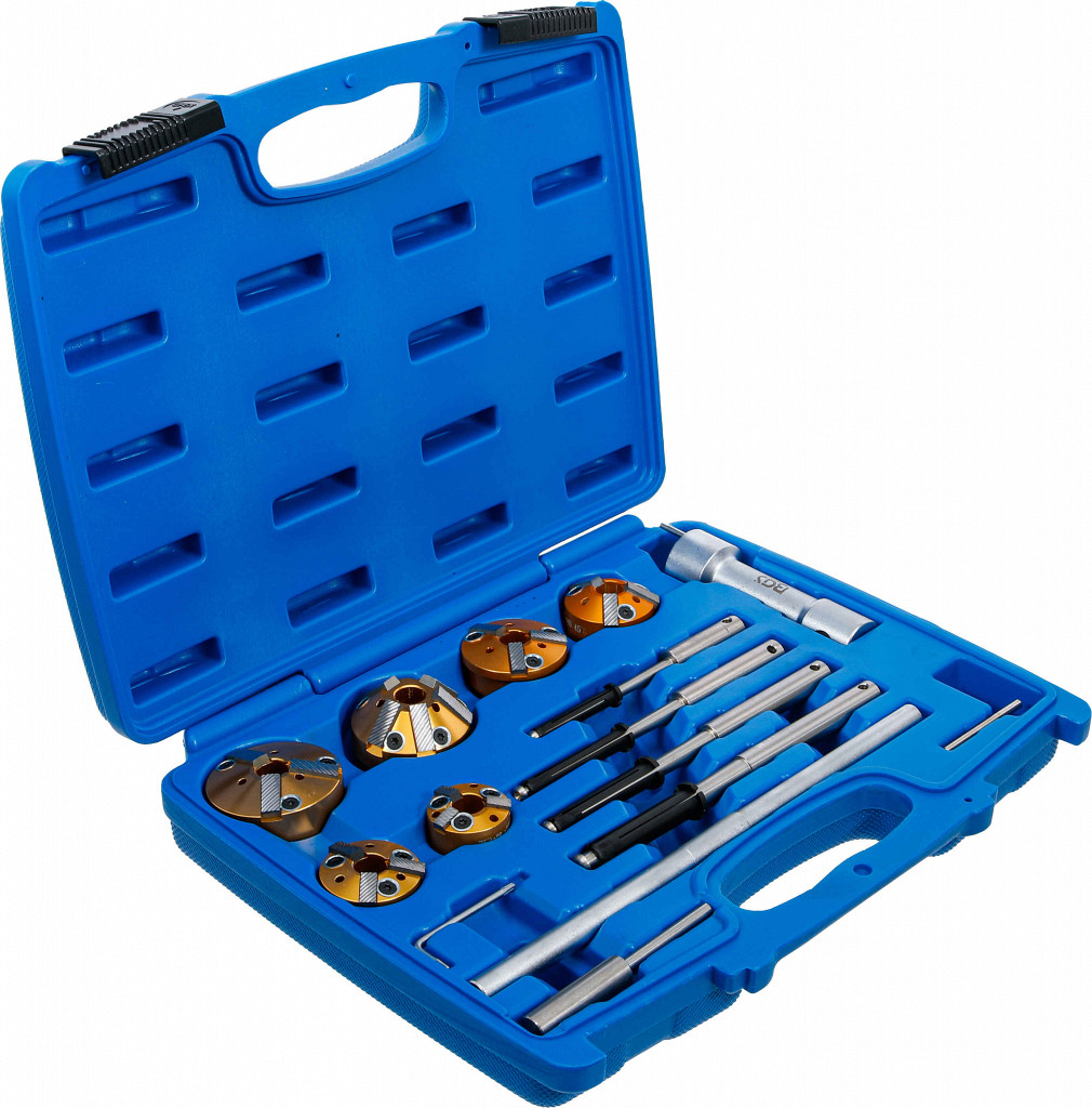 Komplet za obdelavo glav motorjev s trdimi sedeži ventilov. Vključuje 6 dvostranskih rezkarjev različnih premerov in kotov ter 4 nastavljive vodilne puše za ventile premera 6,5–12,5 mm ter T-ročaj.