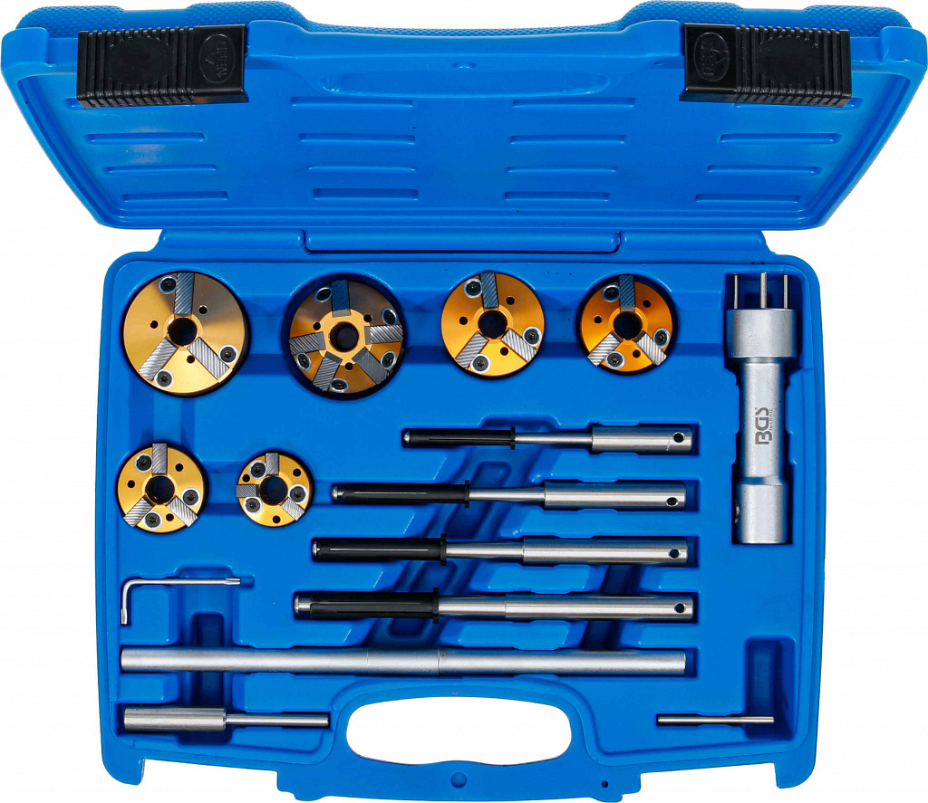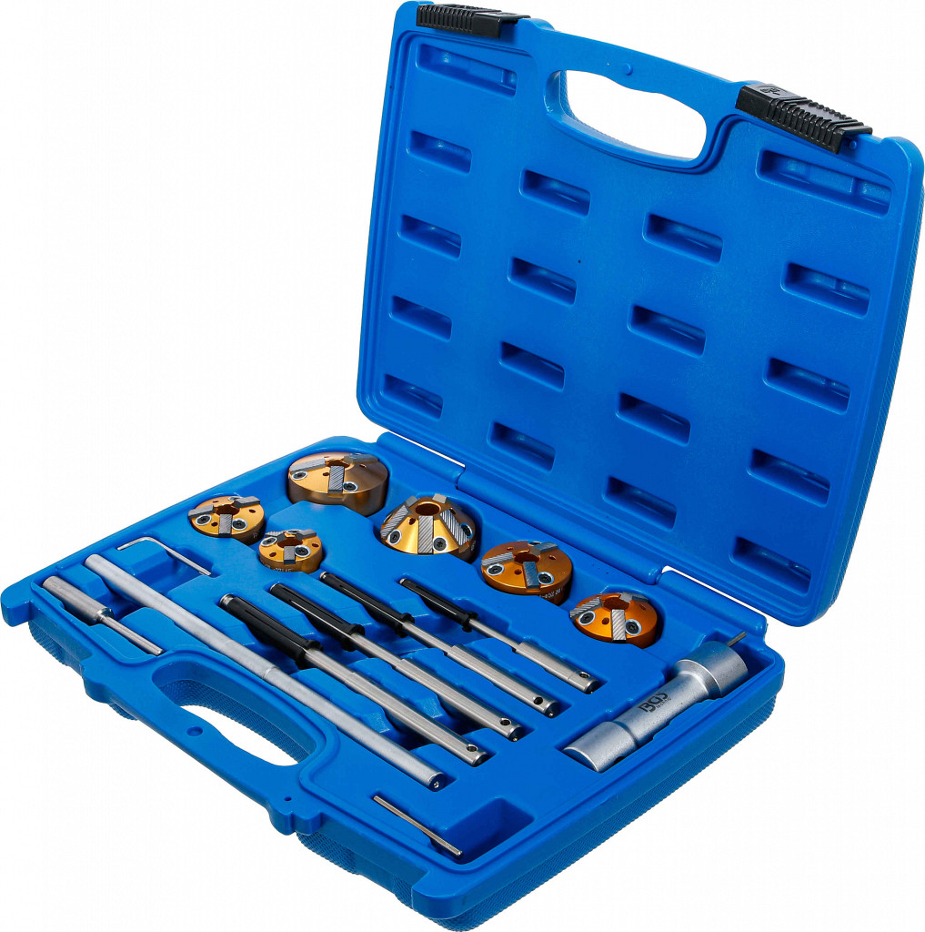 Komplet za obdelavo glav motorjev s trdimi sedeži ventilov. Vključuje 6 dvostranskih rezkarjev različnih premerov in kotov ter 4 nastavljive vodilne puše za...