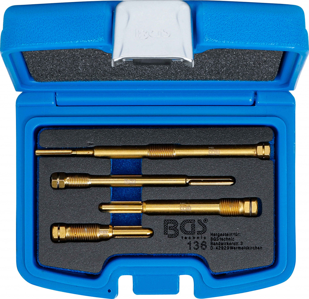 Za čiščenje oziroma odstranjevanje ležišča žarilne svečke; čiščenje je priporočljivo pred vstavitvijo nove žarilne svečke; primerno za motorje znamk Audi, Alfa Romeo, BMW, Fiat, Nissan, Opel, Peugeot, Renault, Toyota itd.; vsebuje 4 rezkarje: M10 × 1,00 (dolžina 107 mm), M10 × 1,25 (dolžina 137 mm), M12 × 1,25 (dolžina 59 mm) in M12 × 1,25 (dolžina 94 mm); material: krom-molibden s titanovo prevleko.