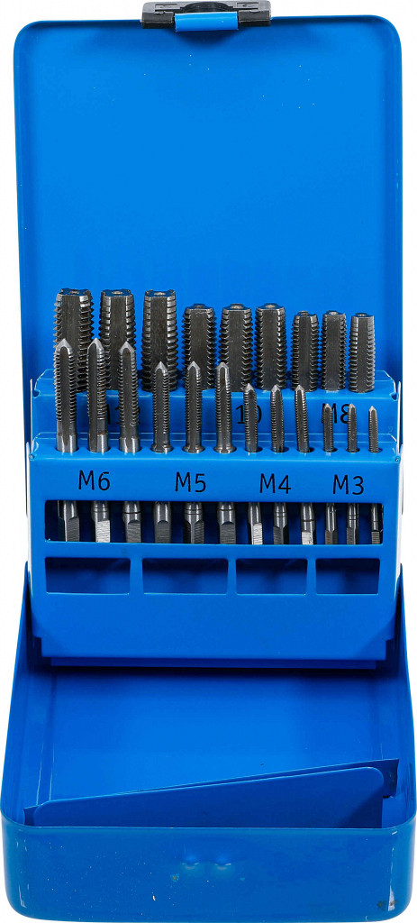 Po DIN 352, v kovinskem kovčku. Vsebina: po 3 navojni svedri M3 x 0.5 - M4 x 0.7 - M5 x 0.8 - M6 x 1.0 - M8 x 1.25 - M10 x 1.5 - M12 x 1.75