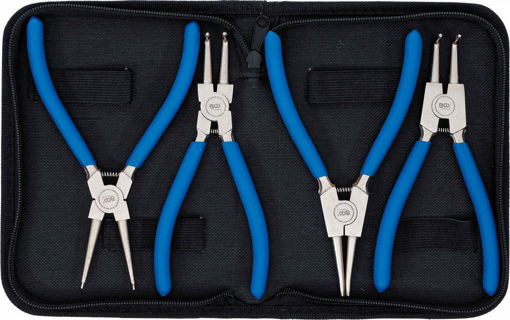 Ravne in ukrivljene konice za notranje in zunanje varnostne obroče, nedrseči gumirani ročaji, konice Ø 2,0 mm, zapakirano v močno vinilno torbico, površinska obdelava: nikljano, obseg dobave: klešče za zunanje obroče ukrivljene 175 mm (maks. odprtina 30 mm), klešče za zunanje obroče ravne 175 mm (maks. odprtina 39 mm), klešče za notranje obroče ukrivljene 175 mm (maks. odprtina 35 mm), klešče za notranje obroče ravne 175 mm (maks. odprtina 38 mm)