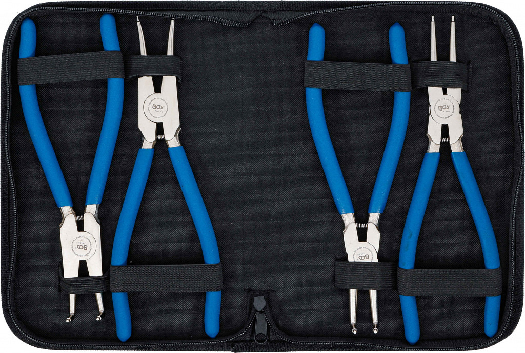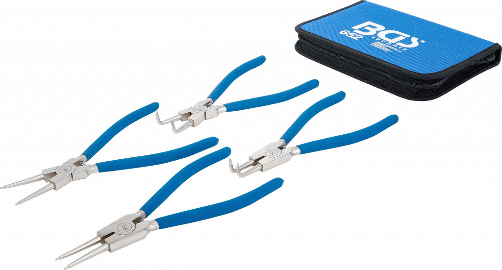 Klešče za snemanje in pritrjevanje obročkov, izolirani ročaji z nedrsečo površino, v torbici. Vsebina: zunanje ukrivljene klešče 250 mm (36 mm), notranje ukrivljene 250 mm (31 mm), notranje ravne 250 mm (39 mm), zunanje ravne 250 mm (39 mm).