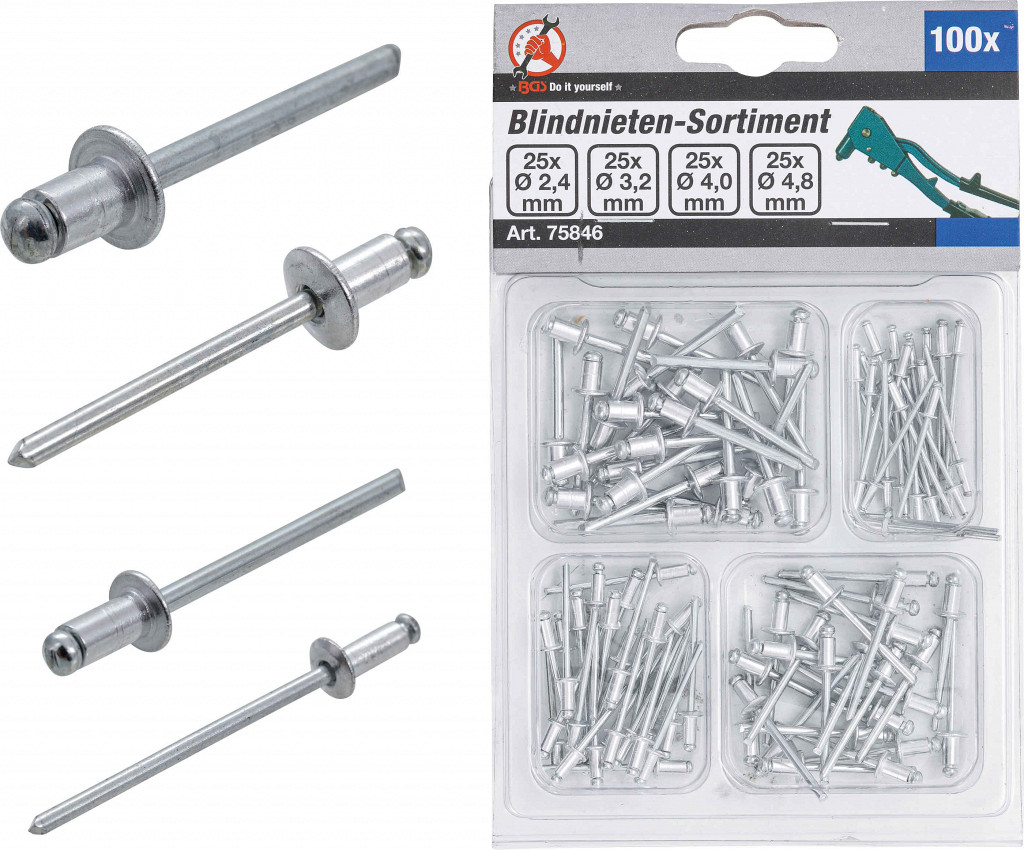 Primerno za klešče za zakovice BGS 400, 401, 403, 75845material: aluminij z jeklenim zatičem.obseg dobave:. 25 slepih zakovic Ø 2,4 x 34 mm 25 slepih zakovic Ø 3,2 x 35 mm25 slepih zakovic Ø 4,0 x 36 mm25 slepih zakovic Ø 4,8 x 39 mm