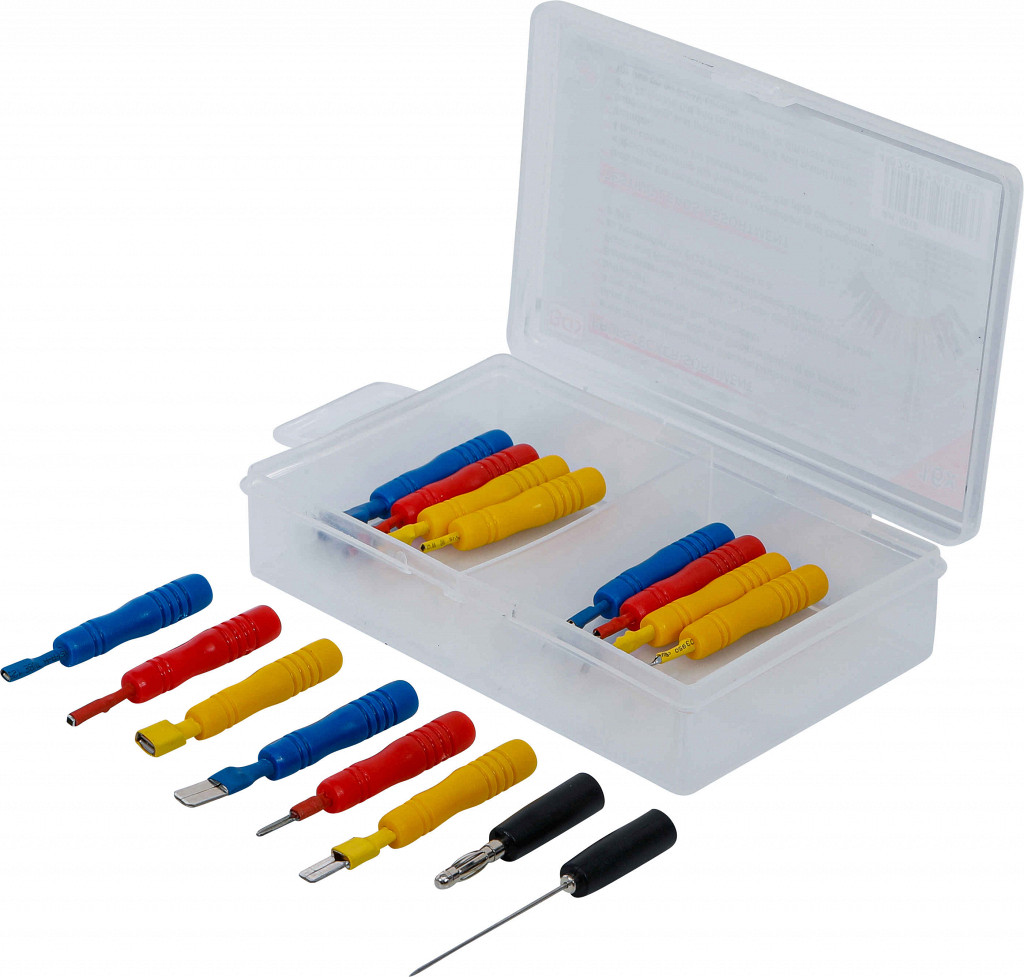 Komplet adapterjev za merjenje na konektorjih in komponentah brez poškodovanja izolacije. Vključuje 4 mm banane, testne igle 1,3 mm, moške in ženske ploščate priključke različnih dimenzij.