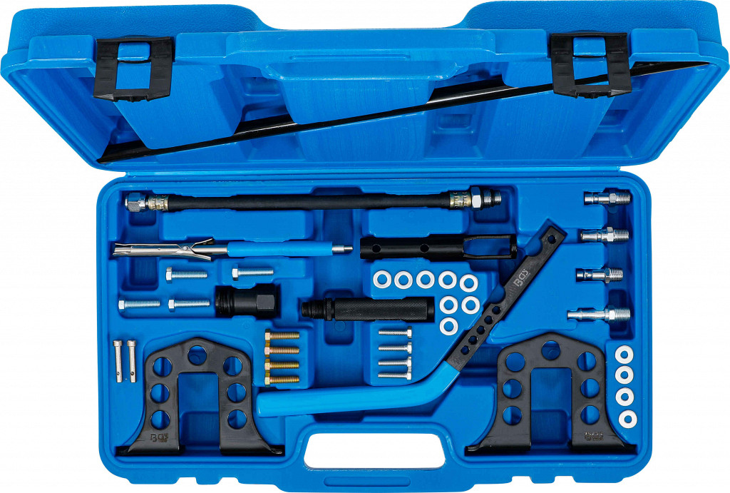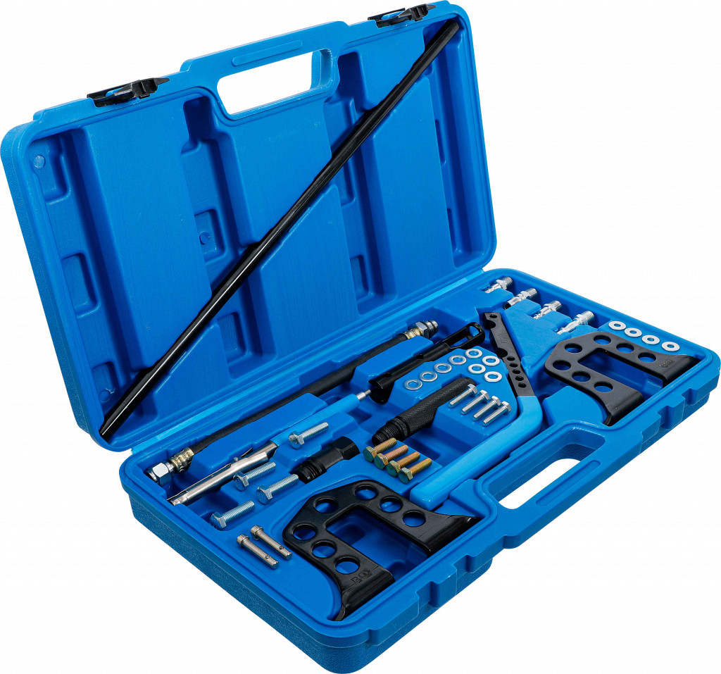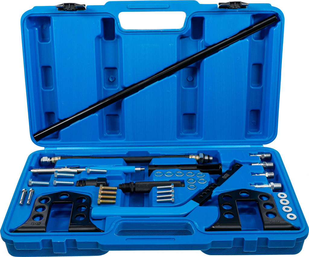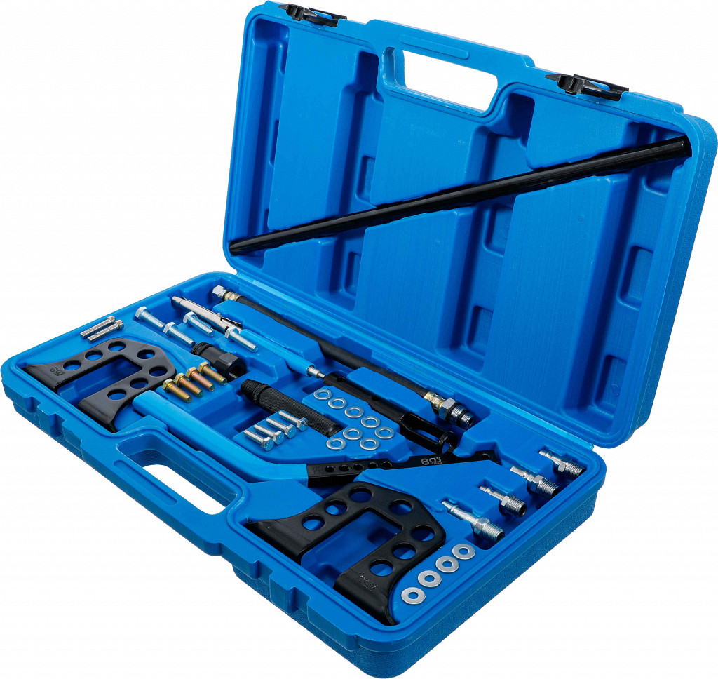 za stiskanje ventilskih vzmeti; omogoča menjavo tesnil ventilskih stebel brez odstranitve glave motorja; s cevjo za dovod stisnjenega zraka v valj; primerno za navoje svečk M14 in M18; vključuje orodje za montažo zagozd.