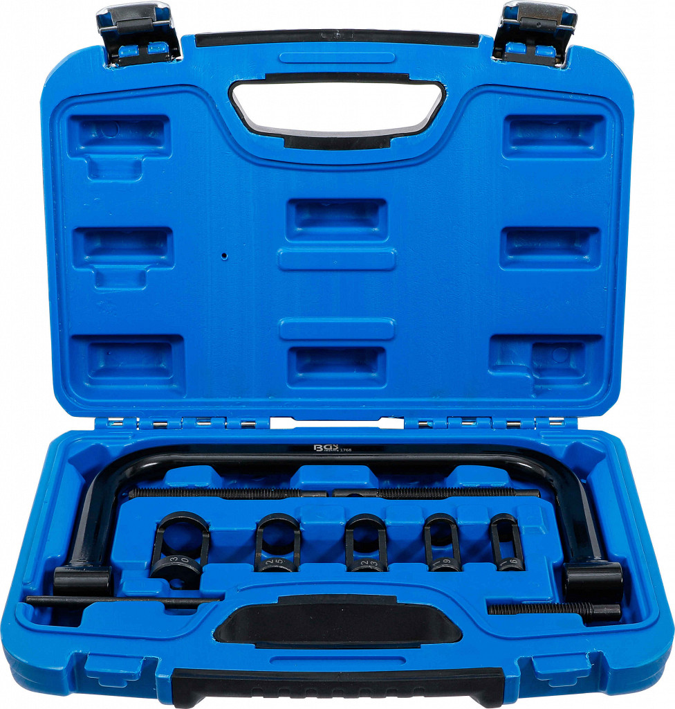za manjše motorje in motorna kolesa; 5 zamenljivih potiskačev ležajev; 100 mm C-pritisna spona. Vsebina: potisni vijaki dolžine 70 mm, 101 mm in 120 mm; potisni nastavki premera 16 mm, 19 mm, 23 mm, 25 mm, 30 mm; teleskopsko magnetno prijemalo; pinceta.