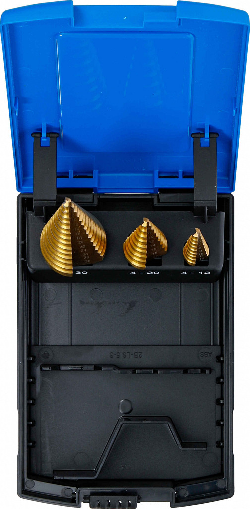 Majhna obraba, daljša življenjska doba. Vsebina: stopničasti sveder Ø 4–12 mm po korakih: 4 - 5 - 6 - 7 - 8 - 9 - 10 - 11 - 12 mm, stopničasti sveder Ø 4–20 mm po korakih: 4 - 6 - 8 - 10 - 12 - 14 - 16 - 18 - 20 mm, stopničasti sveder Ø 4–30 mm po korakih: 4 - 6 - 8 - 10 - 12 - 14 - 16 - 18 - 20 - 22 - 24 - 26 - 28 - 30 mm.