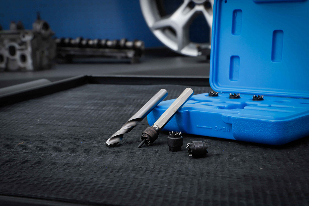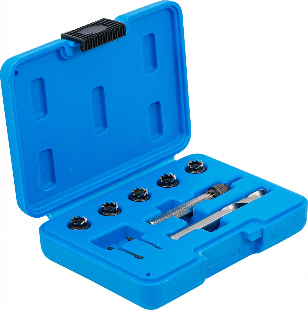 Rezkalni sveder z dvojnim rezilom 9,5 mm, kobaltni HSS sveder za točkovna varjenja 8 x 80 mm, 5 dvostranskih rezalnih kron 9,5 mm, 2 vodilna zatiča, hitrost vrtenja: 700–2000 vrt/min.