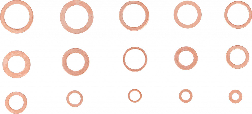 Komplet O-tesnil za izpustne čepke olja v plastični škatli: 10 kosov notranji Ø 5 mm zunanji Ø 10 mm debelina 1 mm, 10 kosov notranji Ø 6 mm zunanji Ø 10 mm debelina 1 mm, 10 kosov notranji Ø 7 mm zunanji Ø 10 mm debelina 1 mm, 10 kosov notranji Ø 8 mm zunanji Ø 12 mm debelina 1 mm, 10 kosov notranji Ø 10 mm zunanji Ø 16 mm debelina 1 mm, 10 kosov notranji Ø 10,5 mm zunanji Ø 17 mm debelina 1,5 mm, 10 kosov notranji Ø 11 mm zunanji Ø 17 mm debelina 1,5 mm, 10 kosov notranji Ø 12 mm zunanji Ø 20 mm debelina 1,5 mm, 10 kosov notranji Ø 12,5 mm zunanji Ø 20 mm debelina 1,5 mm, 10 kosov notranji Ø 14 mm zunanji Ø 18 mm debelina 1 mm, 10 kosov notranji Ø 14 mm zunanji Ø 20 mm debelina 1,5 mm, 10 kosov notranji Ø 15 mm zunanji Ø 20 mm debelina 2 mm, 10 kosov notranji Ø 16 mm zunanji Ø 22 mm debelina 2 mm, 10 kosov notranji Ø 16,5 mm zunanji Ø 24 mm debelina 2 mm, 10 kosov notranji Ø 17,5 mm zunanji Ø 24 mm debelina 2 mm.
