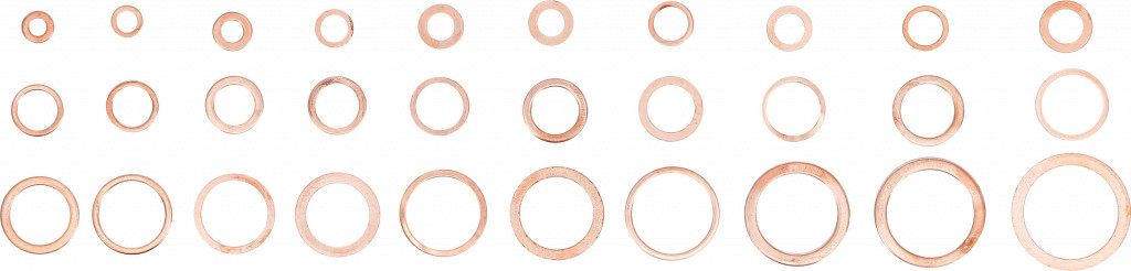 Komplet bakrenih tesnilnih obročkov v plastični škatli: 10 kosov Ø 5 x 9 mm debelina 1,0 mm, 10 kosov Ø 6 x 10 mm debelina 1,0 mm, 10 kosov Ø 6 x 12 mm debelina 1,0 mm, 10 kosov Ø 8 x 12 mm debelina 1,0 mm, 10 kosov Ø 8 x 14 mm debelina 1,0 mm, 10 kosov Ø 8 x 14 mm debelina 1,5 mm, 10 kosov Ø 9 x 14 mm debelina 1,0 mm, 10 kosov Ø 10 x 14 mm debelina 1,0 mm, 10 kosov Ø 10 x 14 mm debelina 1,5 mm, 10 kosov Ø 10 x 16 mm debelina 1,0 mm, 10 kosov Ø 12 x 16 mm debelina 1,0 mm, 10 kosov Ø 12 x 16 mm debelina 1,5 mm, 10 kosov Ø 12 x 18 mm debelina 1,5 mm, 10 kosov Ø 13 x 18 mm debelina 1,0 mm, 10 kosov Ø 14 x 18 mm debelina 1,5 mm, 10 kosov Ø 14 x 20 mm debelina 1,5 mm, 10 kosov Ø 14 x 20 mm debelina 2,0 mm, 10 kosov Ø 16 x 20 mm debelina 1,5 mm, 10 kosov Ø 16 x 22 mm debelina 1,5 mm, 10 kosov Ø 18 x 22 mm debelina 1,5 mm, 10 kosov Ø 18 x 24 mm debelina 1,5 mm, 10 kosov Ø 20 x 24,5 mm debelina 1,5 mm, 10 kosov Ø 20 x 24,5 mm debelina 0,8 mm, 10 kosov Ø 19 x 26 mm debelina 2,0 mm, 10 kosov Ø 22 x 27 mm debelina 1,5 mm, 10 kosov Ø 22 x 29 mm debelina 1,5 mm, 10 kosov Ø 24 x 29 mm debelina 1,5 mm, 10 kosov Ø 24 x 32 mm debelina 2,0 mm, 10 kosov Ø 26 x 34 mm debelina 2,0 mm, 10 kosov Ø 28 x 36 mm debelina 2,0 mm.