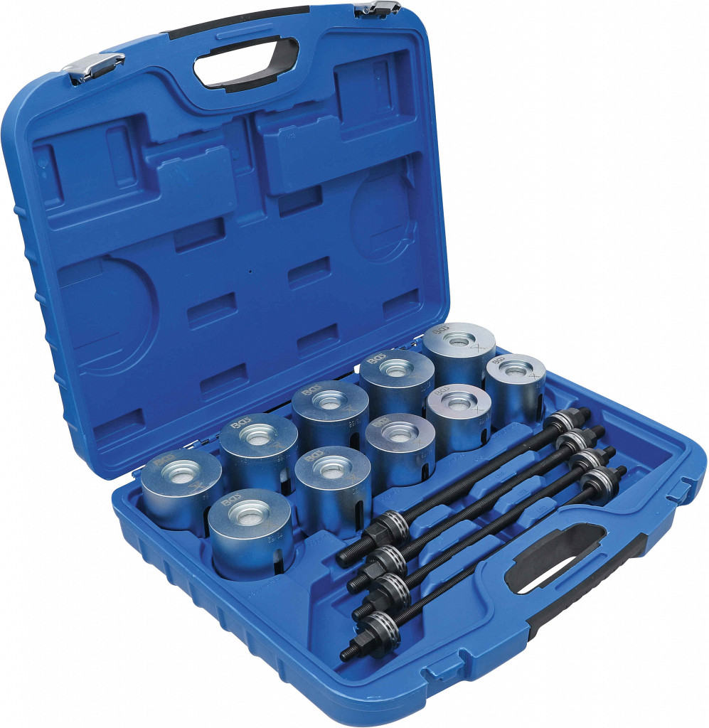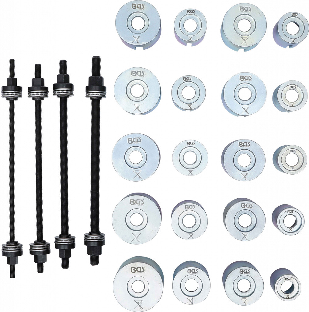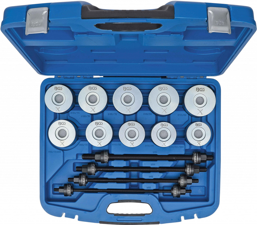 Univerzalni tip za vse avtomobilske modele; primeren tudi za montažo in demontažo tihih ležajev, gumijastih in krogličnih ležajev; prav tako primeren za gumijaste puše in radialna tesnila gredi; gladko delovanje zaradi visokokakovostnega krogličnega ležaja na vretenasti matici. Obseg dobave: štiri vretena dolžine 350 mm v velikostih M10, M12, M14 in M16; 20 potisnih plošč (zunanji Ø × notranji Ø): 44×34, 46×36, 48×38, 50×40, 52×42, 54×44, 56×46, 58×48, 60×50, 62×52, 64×54, 66×56, 68×58, 70×60, 72×62, 74×64, 76×66, 78×68, 80×70, 82×72.