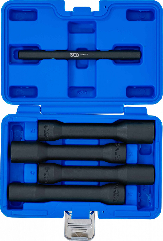 Za odvijanje poškodovanih vijakov in matic. Spiralni profil se zareže v glavo in omogoča varno odvijanje. Vsebina: posebne vtičnice, dolžina 150 mm, pogon 12,5 mm (1/2"): 17, 19, 21, 22 mm, vključno s T-ročajem.