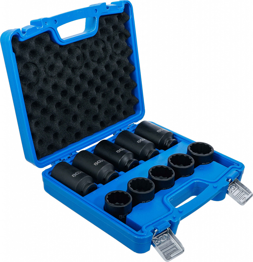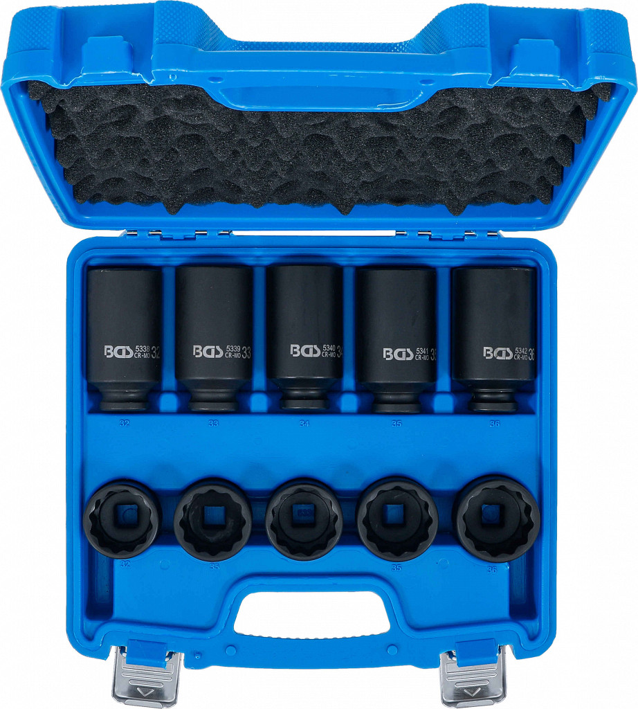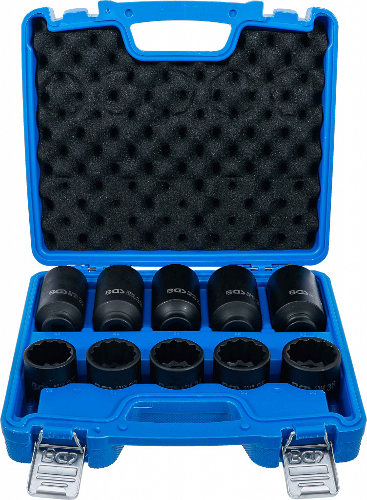 Udarni nasadni ključi 12-robni v kratki in globoki izvedbi (48 in 85 mm), kompaktna sestava, vključuje ustrezne velikosti za delo na osrednjem vijaku pogonske gredi, prilagojeno omejenemu prostoru v pestu kolesa, primerno za ročne in udarne vijačnike, pritrditev na udarni vijačnik s pinom in O-obročkom, varno in pregledno shranjevanje v kovčku. Obseg dobave: 12-robni udarni ključi globoki 32–36 mm, 12-robni udarni ključi kratki 32–36 mm.
