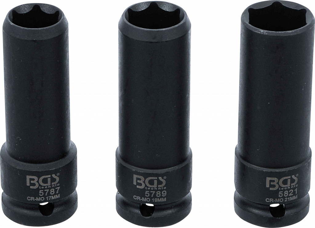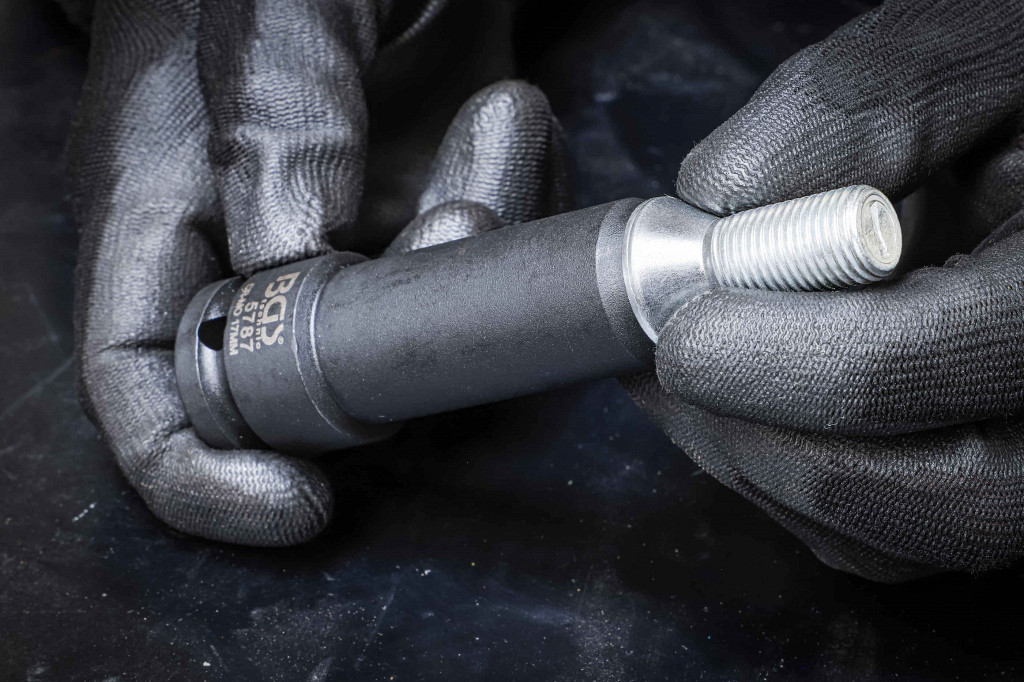 Za sestavljanje in demontažo vijačnih tirnih plošč za pravilno pritrditev koles vijak ne sme štrleti iz vdolbine gosenicekratke glave vijakov se sprostijo in varno pritegnejo dobro držanje z glavo vijaka za ročne in udarne ključe se lahko pritrdijo na udarni ključ z zatičem in O-obročem. Obseg dobave: 1 udarna posebna vtičnica | 12,5-milimetrski (1/2-palčni pogon) | 17 mm1 udarno posebno vtičnico | 12,5-milimetrski (1/2-palčni pogon) | 19 mm1 udarna posebna vtičnica | 12,5-milimetrski (1/2-palčni pogon) | 21 mm