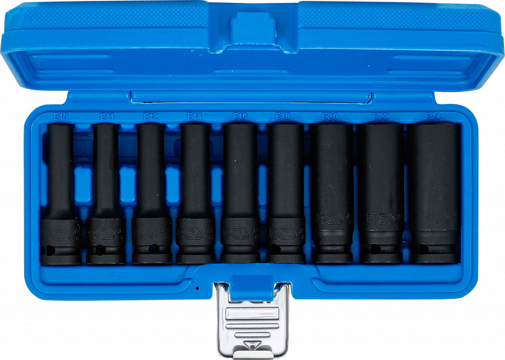 5204 Za ročne in udarne vijačnike, z možnostjo pritrditve na udarni vijačnik s pomočjo zatiča in O-obroča. Vsebina: udarni nasadni ključi 12.5 mm (1/2") pogon, tip E: E10, E11, E12, E14, E16, E18, E20, E22, E24.