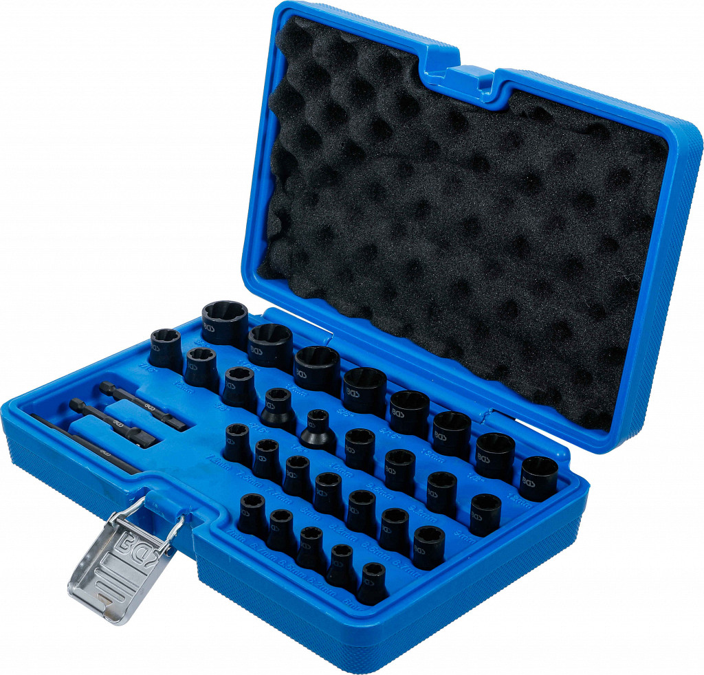 Kompaktna sestava orodij za izvlačenje vijakov za različne aplikacijeza odstranjevanje vijakov in matic z okvarjenimi pogonskimi glavami s stožčasto oblikovanimi rezalnimi robovi ostri vijačni utori se bodo ugriznili v pritrjene ali okvarjene vijake in matice ter jih sprostili orodje za prebijanje za odstranjevanje poškodovanih vijakov iz ekstraktorja vijakov. 1 vijačna vtičnica (spiralni profil) / izvleček vijaka | 6,3-milimetrski (1/4-palčni pogon) | 6 mm1 vrtljiva vtičnica (spiralni profil) / izvleček vijakov | 6,3-milimetrski (1/4-palčni pogon) | 6,2 mm1 vrtljiva vtičnica (spiralni profil) / izvleček vijakov | 6,3-milimetrski (1/4-palčni pogon) | 6,5 mm1 vrtljiva vtičnica (spiralni profil) / izvleček vijakov | 6,3-milimetrski (1/4-palčni pogon) | 6,7 mm1 vrtljiva vtičnica (spiralni profil) / izvleček vijakov | 6,3-milimetrski (1/4-palčni pogon) | 7 mm1 vrtljiva vtičnica (spiralni profil) / izvleček vijakov | 6,3-milimetrski (1/4-palčni pogon) | 7,2 mm1 vrtljiva vtičnica (spiralni profil) / izvleček vijakov | 6,3-milimetrski (1/4-palčni pogon) | 7,5 mm1 vrtljiva vtičnica (spiralni profil) / izvleček vijakov | 6,3-milimetrski (1/4-palčni pogon) | 7,7 mm1 vrtljiva vtičnica (spiralni profil) / izvleček vijaka | 6,3-milimetrski (1/4-palčni pogon) | 8 mm1 vrtljiva vtičnica (spiralni profil) / izvleček vijakov | 6,3-milimetrski (1/4-palčni pogon) | 8,2 mm1 vrtljiva vtičnica (spiralni profil) / izvleček vijaka | 6,3-milimetrski (1/4-palčni pogon) | 8,5 mm1 vrtljiva vtičnica (spiralni profil) / izvleček vijakov | 6,3-milimetrski (1/4-palčni pogon) | 8,7 mm1 vrtljiva vtičnica (spiralni profil) / izvleček vijakov | 6,3-milimetrski (1/4-palčni pogon) | 9 mm1 vrtljiva vtičnica (spiralni profil) / izvleček vijaka | 6,3-milimetrski (1/4-palčni pogon) | 9,2 mm1 vrtljiva vtičnica (spiralni profil) / izvleček vijakov | 6,3-milimetrski (1/4-palčni pogon) | 9,5 mm1 vrtljiva vtičnica (spiralni profil) / izvleček vijakov | 6,3-milimetrski (1/4-palčni pogon) | 10 mm1 vrtljiva vtičnica (spiralni profil) / izvleček vijakov | 10-milimetrski (3/8-palčni pogon) | 1/4"1 vrtljiva vtičnica (spiralni profil) / izvleček vijakov | 10-milimetrski (3/8-palčni pogon) | 5/16"1 vrtljiva vtičnica (spiralni profil) / izvleček vijakov | 10-milimetrski (3/8-palčni pogon) | 3/8"1 vrtljiva vtičnica (spiralni profil) / izvleček vijakov | 10-milimetrski (3/8-palčni pogon) | 10 mm1 vrtljiva vtičnica (spiralni profil) / izvleček vijakov | 10-milimetrski (3/8-palčni pogon) | 7/16"1 vrtljiva vtičnica (spiralni profil) / izvleček vijakov | 10-milimetrski (3/8-palčni pogon) | 12 mm1 vrtljiva vtičnica (spiralni profil) / izvleček vijakov | 10-milimetrski (3/8-palčni pogon) | 1/2"1 vrtljiva vtičnica (spiralni profil) / izvleček vijakov | 10-milimetrski (3/8-palčni pogon) | 13 mm1 vrtljiva vtičnica (spiralni profil) / izvleček vijakov | 10-milimetrski (3/8-palčni pogon) | 9/16"1 vrtljiva vtičnica (spiralni profil) / izvleček vijakov | 10-milimetrski (3/8-palčni pogon) | 5/8"1 vrtljiva vtičnica (spiralni profil) / izvleček vijakov | 10-milimetrski (3/8-palčni pogon) | 17 mm1 vrtljiva vtičnica (spiralni profil) / izvleček vijakov | 10-milimetrski (3/8-palčni pogon) | 11/16"1 vrtljiva vtičnica (spiralni profil) / izvleček vijakov | 10-milimetrski (3/8-palčni pogon) | 3/4"1 udarni električni vrtalni adapter | Pogon 6,3 mm (1/4") / 10 mm (3/8") 1 adapter za udarno električno vrtalko | 6,3 mm (1/4") pogon / 6,3 mm (1/4") 1 trkalno orodje 7 x 90 mm
