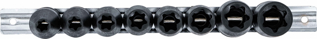 Komplet udarnih E-nasadnih ključev na letvi, 1/2" pogon, velikosti E10–E24, primerni za ročne in udarne raglje.