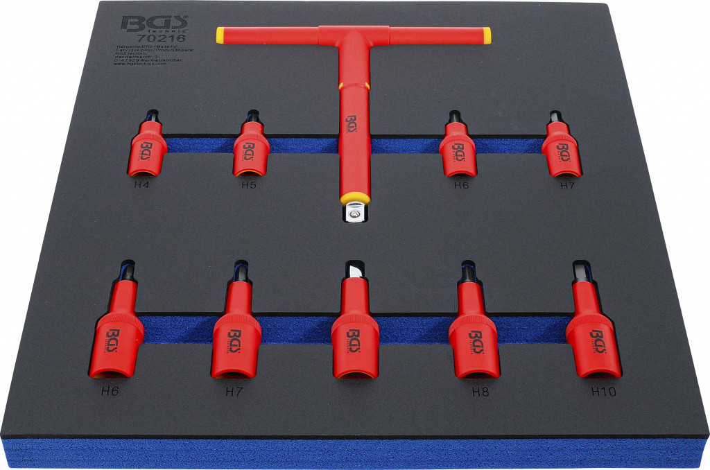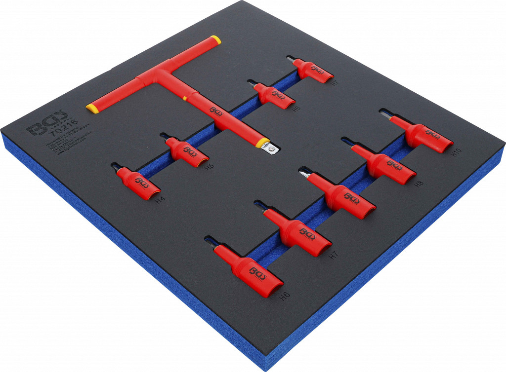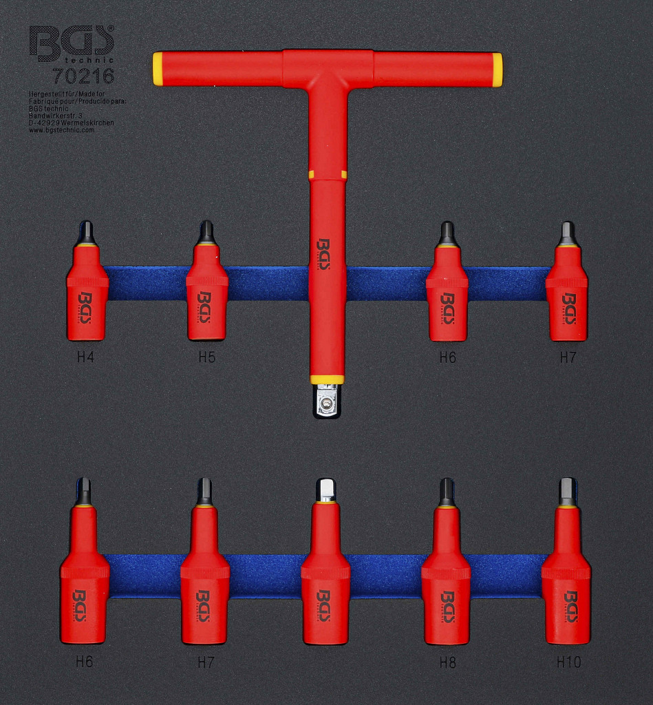 Set izoliranih VDE nasadnih ključev za električne sisteme, testirano do 1000 V, vsebuje bitne nasadke 3/8" in 1/2" (4–10 mm), T-ročaj, adapter in pladenj 2/3.