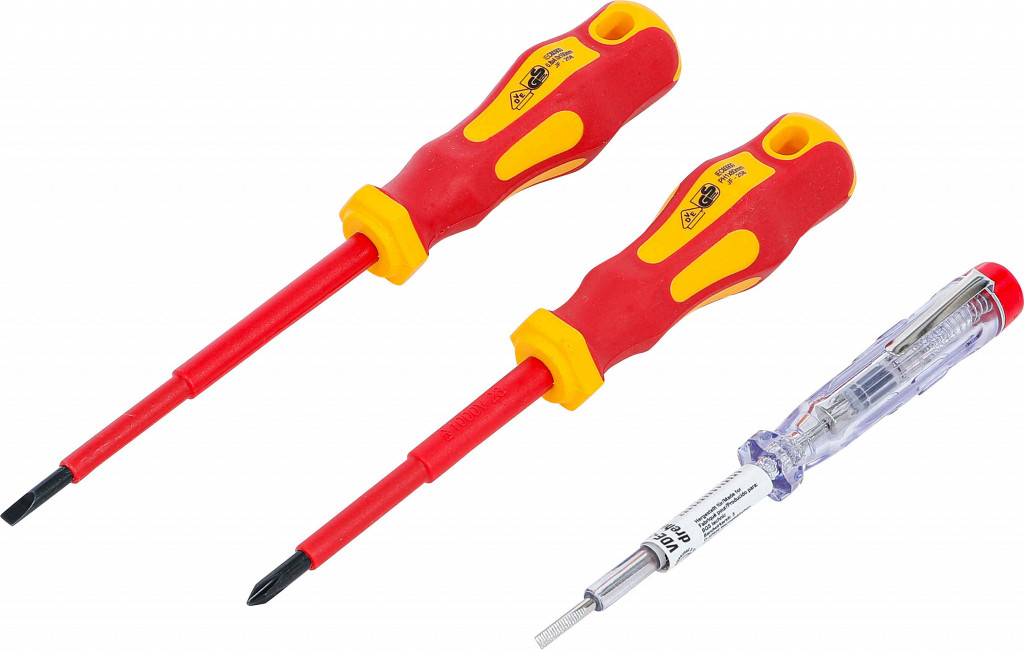 Kompaktni VDE set za električarje. Vsebuje križni izvijač, ravni izvijač z magnetno konico, tester napetosti, ergonomični ročaj, orodja testirana po DIN...