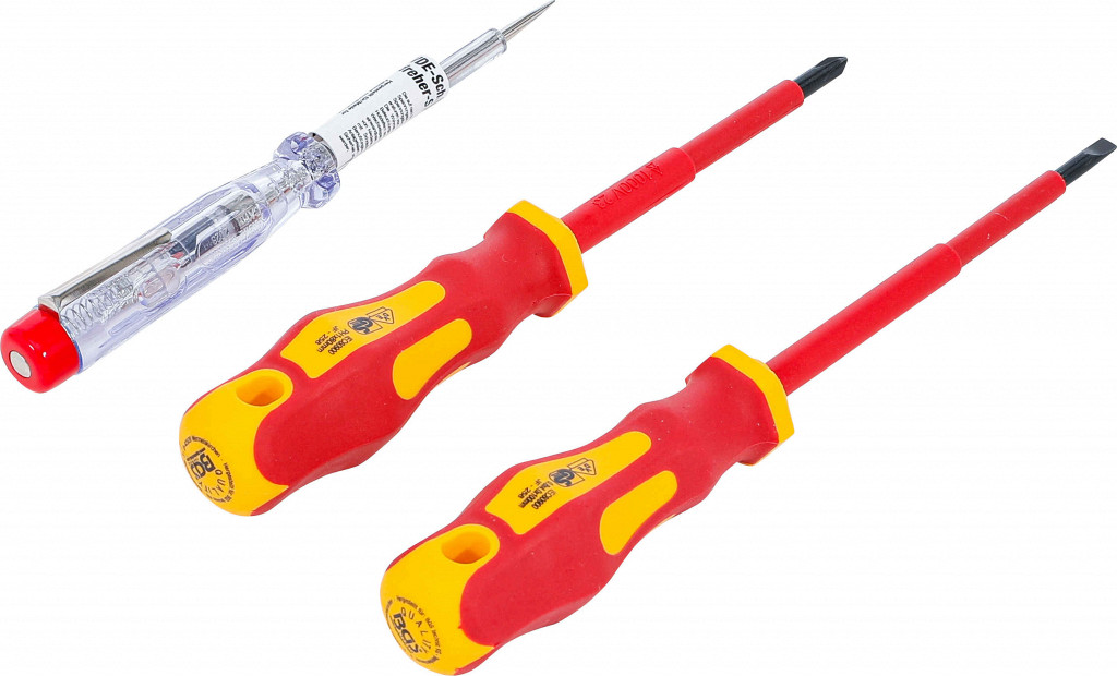 Kompaktni VDE set za električarje. Vsebuje križni izvijač, ravni izvijač z magnetno konico, tester napetosti, ergonomični ročaj, orodja testirana po DIN EN/IEC 60900