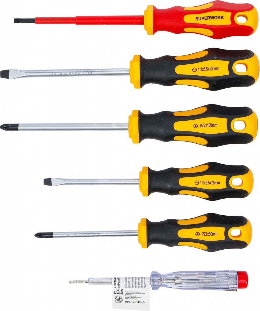 VDE izvijači po DIN EN 60900. Vsebina: PH1, PH2, SL 0.5 x 3, SL 0.8 x 4 mm, tester napetosti