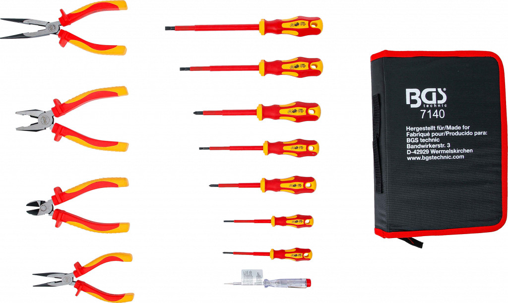 Set izoliranih izvijačev in klešč v torbi z zadrgo, izolacija po DIN EN 60900, vključuje tester napetosti, izvijače SL in PH različnih dimenzij ter izolirane kombinirane klešče, stranske klešče in podaljšane klešče.