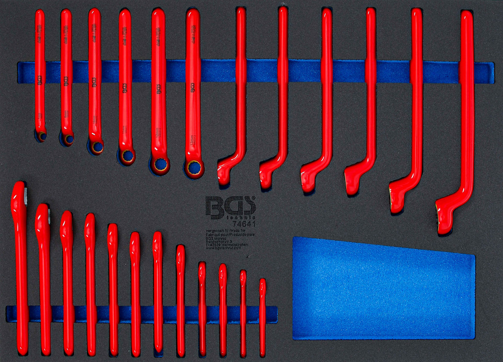 Popolna kombinacija orodij za uporabo v elektroinštalacijah ali za popravila in vzdrževanje hibridnih in električnih vozilopremljenih z izoliranimi orodji in preizkušena v skladu z DIN EN/IEC 60900globok offset, enostranski obročni ključ in enojni odprti ključ za varno delo v območju napetostnih delov zmanjšuje tveganje kratkega stikapopolno orodje za električarje in elektrotehnike za vgradnjo terminalov in tulcev, vodniški priključki, vijačenje vodilkKovani pladenj za orodje iz visoko odporne peneorodje je zaščiteno v pladnju iz trde pene in je nedrseče shranjeno v vdolbinahvsako posamezno orodje ima svoje primernoprimernoprimerno za vse delavniške vozičke BGS.obseg dobave:. 1 VDE obročni ključ | Globok odmik | 7 mm1 VDE obročni ključ | Globok odmik | 8 mm1 VDE obročni ključ | Globok odmik | 10 mm (BGS 72010)1 VDE obročni ključ | Globok odmik | 11 mm (BGS 72011)1 VDE obročni ključ | Globok odmik | 12 mm (BGS 72012)1 VDE obročni ključ | Globok odmik | 13 mm (BGS 72013)1 VDE obročni ključ | Globok odmik | 14 mm (BGS 72014)1 VDE obročni ključ | Globok odmik | 15 mm (BGS 72015)1 VDE obročni ključ | Globok odmik | 16 mm (BGS 72016)1 VDE obročni ključ | Globok odmik | 17 mm (BGS 72017)1 VDE obročni ključ | Globok odmik | 19 mm (BGS 72019)1 VDE obročni ključ | Globok odmik | 22 mm (BGS 72022)1 VDE enojni odprti ključ | 7 mm (BGS 71057)1 VDE enojni odprti ključ | 8 mm (BGS 71058)1 VDE enojni odprti ključ | 10 mm (BGS 71060)1 VDE enojni odprti ključ | 11 mm (BGS 71061)1 VDE enojni odprti ključ | 12 mm (BGS 71062)1 VDE enojni odprti ključ | 13 mm (BGS 71063)1 VDE enojni odprti ključ | 14 mm (BGS 71064)1 VDE enojni odprti ključ | 15 mm (BGS 71065)1 VDE enojni odprti ključ | 16 mm (BGS 71066)1 VDE enojni odprti ključ | 17 mm (BGS 71067)1 VDE enojni odprti ključ | 19 mm (BGS 71069)1 VDE enojni odprti ključ | 21 mm (BGS 71071)