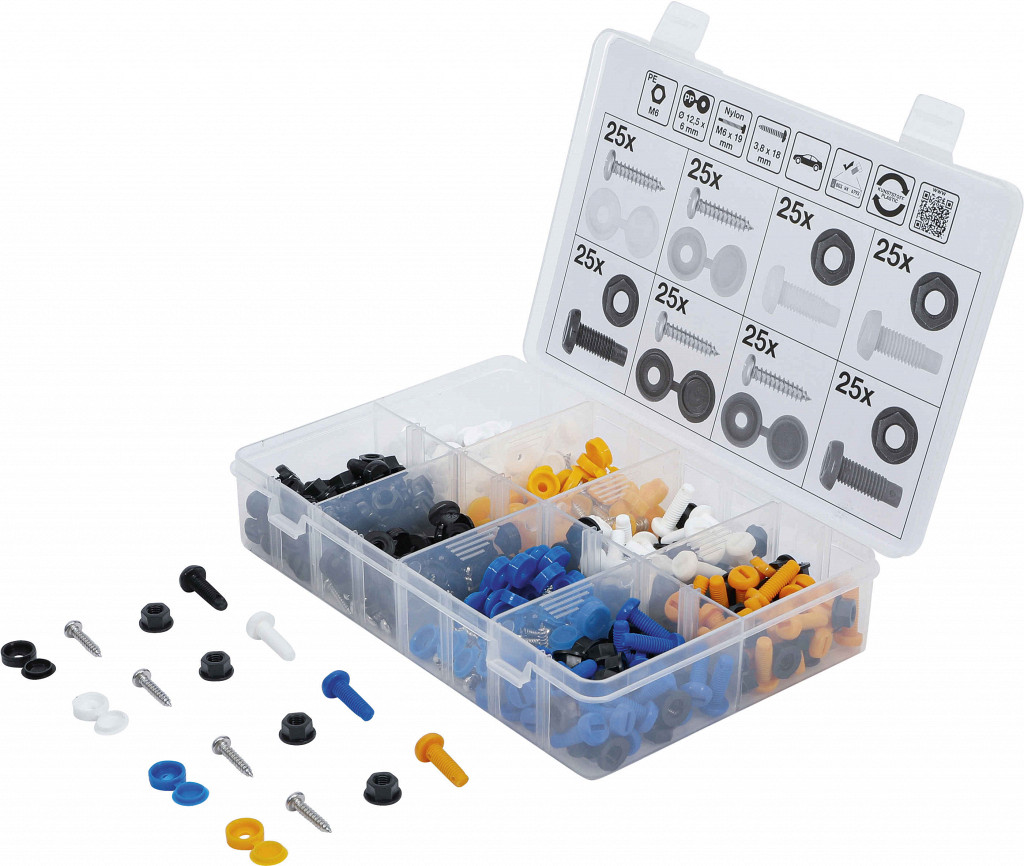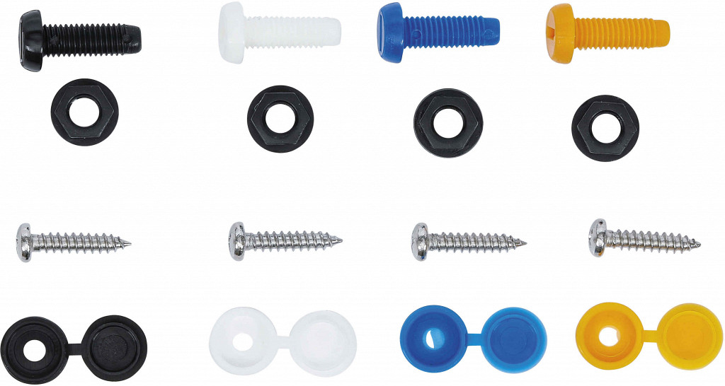 Set vijakov za registrske tablice; vsebuje vijake iz nerjavečega jekla z belimi, rumenimi, modrimi in črnimi kapicami ter plastične vijake z maticami v več barvah; vse v plastični škatli.