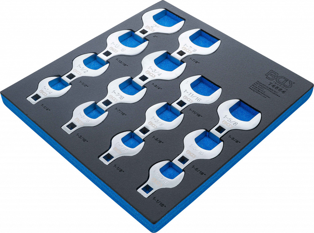 Za zategovanje in rahljanje cevnih povezav omogoča dostop do priključnih komponent v težkih položajih namestitve, kjer ni mogoče uporabiti ključa ali standardne vtičnicerazlične velikosti za velikosti ključev od velikosti 1 1/1/16" - 2" palcaza ročno upravljanjeza uporabo z momentnim ključem ali reverzibilnim pladnjem za zaskočno orodje iz visoko odporne peneorodja so zaščitena v pladnju iz trde pene in so shranjena v vdolbinah na nedrseč načinVsako posamezno orodje ima svoje ustrezno mestoprimerno za vsi delavniški vozički BGS.obseg dobave:... 1 odprti ključ Crowfoot | 12,5-milimetrski (1/2-palčni pogon) | 1.1/16"1 Crowfoot odprti ključ | 12,5-milimetrski (1/2-palčni pogon) | 1.1/8"1 Crowfoot odprti ključ | 12,5-milimetrski (1/2-palčni pogon) | 1.3/16"1 Crowfoot odprti ključ | 12,5-milimetrski (1/2-palčni pogon) | 1.1/4"1 Crowfoot odprti ključ | 12,5-milimetrski (1/2-palčni pogon) | 1.5/16"1 Crowfoot odprti ključ | 12,5-milimetrski (1/2-palčni pogon) | 1.3/8"1 Crowfoot odprti ključ | 12,5-milimetrski (1/2-palčni pogon) | 1.7/16"1 Crowfoot odprti ključ | 12,5-milimetrski (1/2-palčni pogon) | 1.1/2"1 Crowfoot odprti ključ | 12,5-milimetrski (1/2-palčni pogon) | 1.5/8"1 Crowfoot odprti ključ | 12,5-milimetrski (1/2-palčni pogon) | 1.11/16"1 Crowfoot odprti ključ | 12,5-milimetrski (1/2-palčni pogon) | 1.3/4"1 odprti ključ Crowfoot | 12,5-milimetrski (1/2-palčni pogon) | 1.13/16"1 Crowfoot odprti ključ | 12,5-milimetrski (1/2-palčni pogon) | 1.7/8"1 Crowfoot odprti ključ | 12,5-milimetrski (1/2-palčni pogon) | 2"