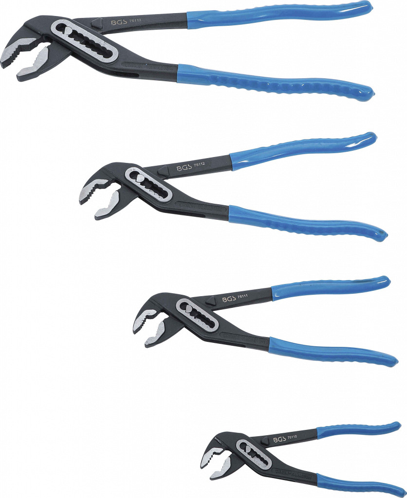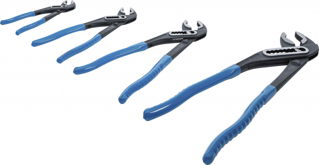 Set vodnih klešč z varnostnimi ročaji, kovane in kaljene, črna lakirana površina, polirane čeljusti in člen, ročaji z izolacijo proti drsenju, pakirano v tetron etuiju, vsebuje: 1x vodne klešče 175 mm (odpiranje do 27 mm), 1x vodne klešče 240 mm (odpiranje do 38 mm), 1x vodne klešče 300 mm (odpiranje do 44 mm), 1x vodne klešče 400 mm (odpiranje do 80 mm).