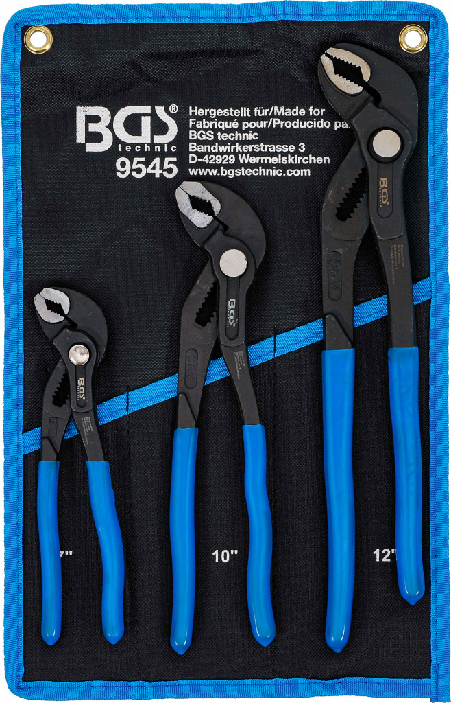 Komplet treh klešč z varnostnimi ročaji v torbici, dolžine 175 mm (max. odprtje 32 mm), 240 mm (36 mm) in 300 mm (52 mm).