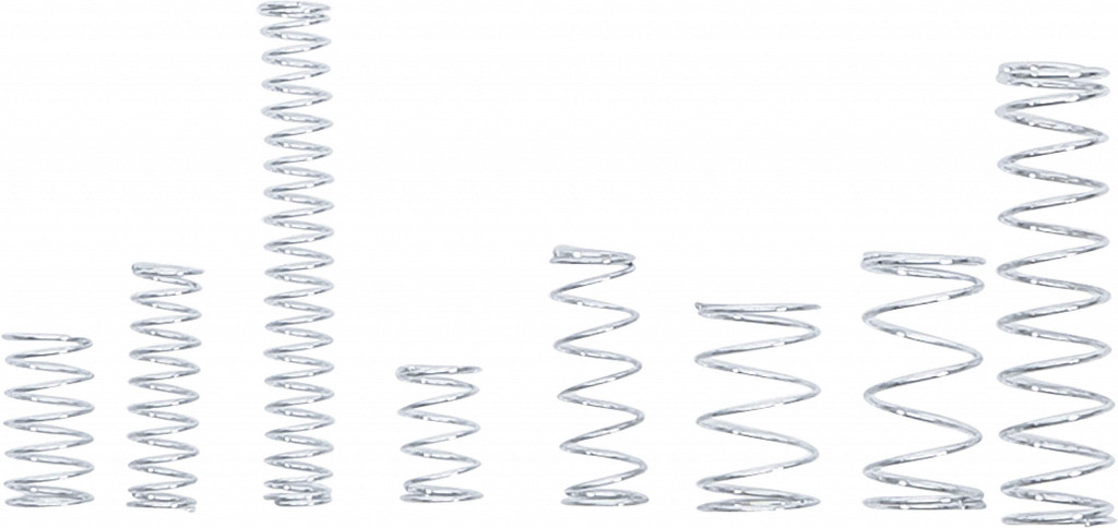 Komplet tlačnih vzmeti v plastični škatli. Vsebina: 40 kosov 5,5 x 17,5 mm, 20 kosov 5,5 x 38,0 mm, 60 kosov 6,5 x 10,0 mm, 40 kosov 7,0 x 12,5 mm, 30 kosov 7,0 x 19,0 mm, 12 kosov 9,0 x 35 mm, 20 kosov 9,5 x 16 mm, 24 kosov 9,5 x 19 mm.